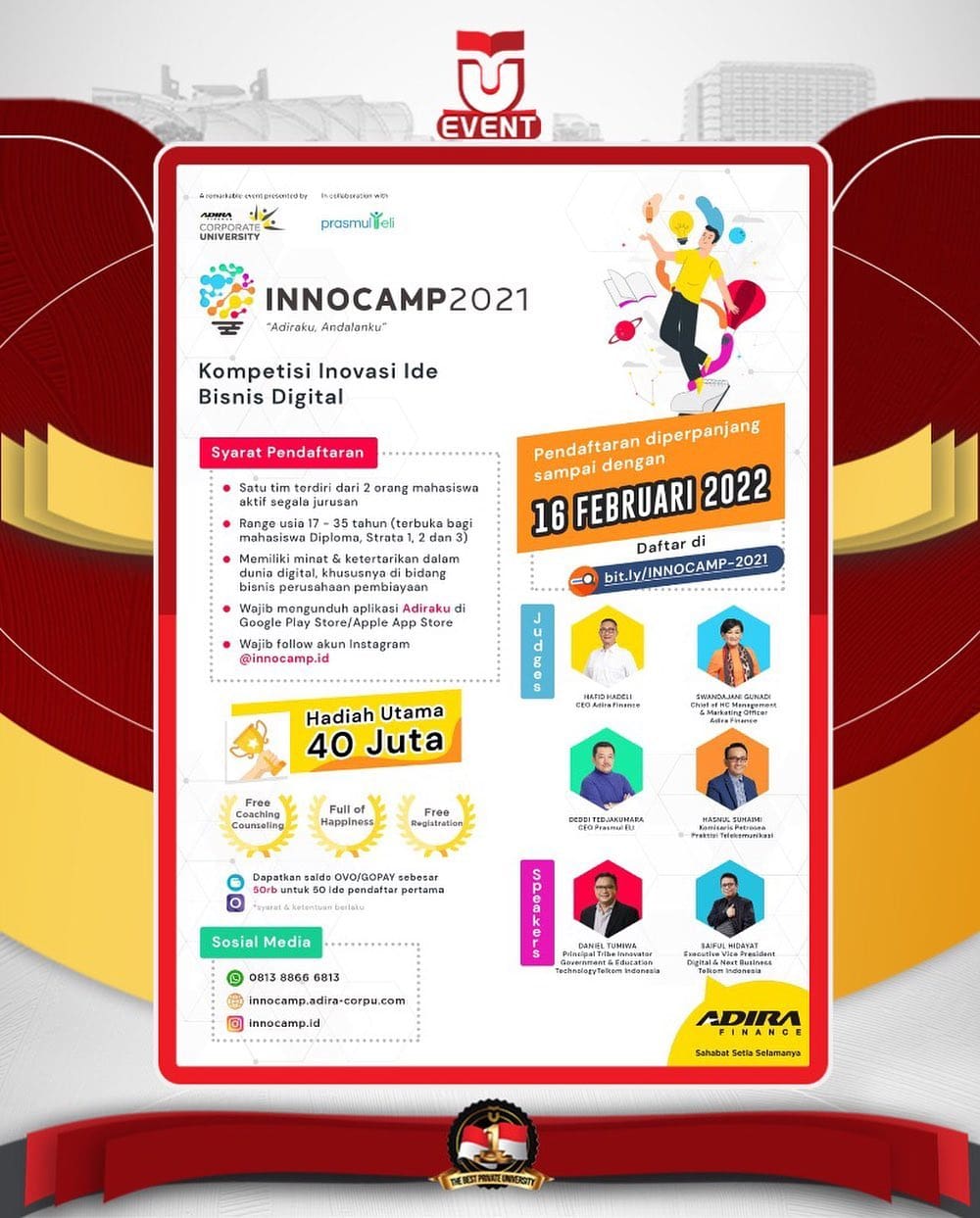 Yuukk tunggu apa lagi, segera daftarin ide inovasi kamu buat ikut Innocamp, masih ada slot buat voucher OVO/Gopay buat 50 Ide pertama yg tervalidasi, dan juga dapetin hadiah utama uang tunai 40 Juta Rupiah!