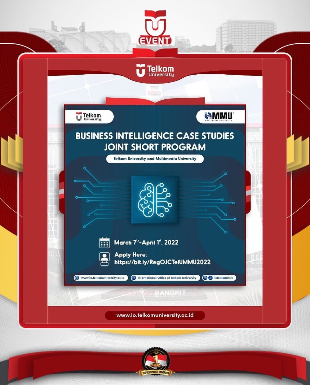 We cordially invite you to join “Business Intelligence Case Studies”, A Joint Short Program organized by Telkom University, Indonesia and Multimedia University, Malaysia.