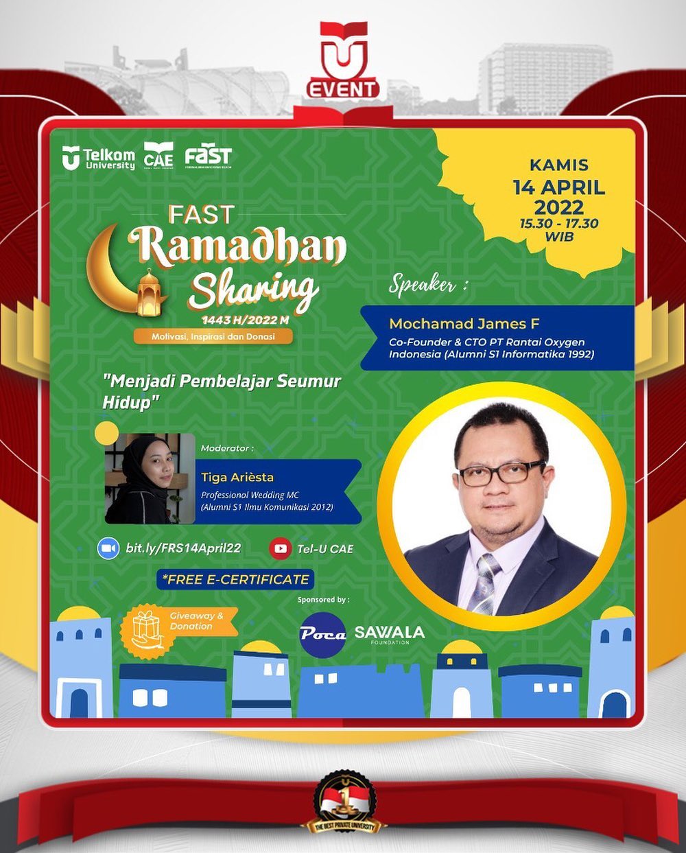 FAST Ramadhan Sharing kali ini bersama Mochamad James F, Alumni S1 Informatika 1992, beliau akan sharing pengalaman inspirasinya yang bekerja sebagai Co-Founder & CTO PT Rantai Oxygen Indonesia dengan membawa tema “Menjadi Pembelajar Seumur Hidup”.