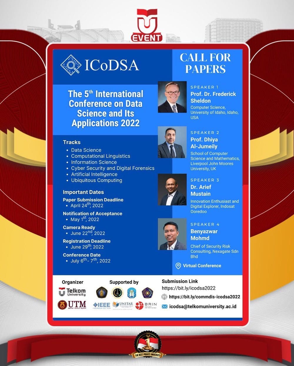 The advancement of today’s computing technology has driven people to generate a vast amount of data with the size and variety that have never been experienced in the history of computing. The need to process and analyze big data attracts researchers interest to prepare solutions. ICoDSA 2022 is organized by Telkom University and Universiti Teknologi Malaysia.