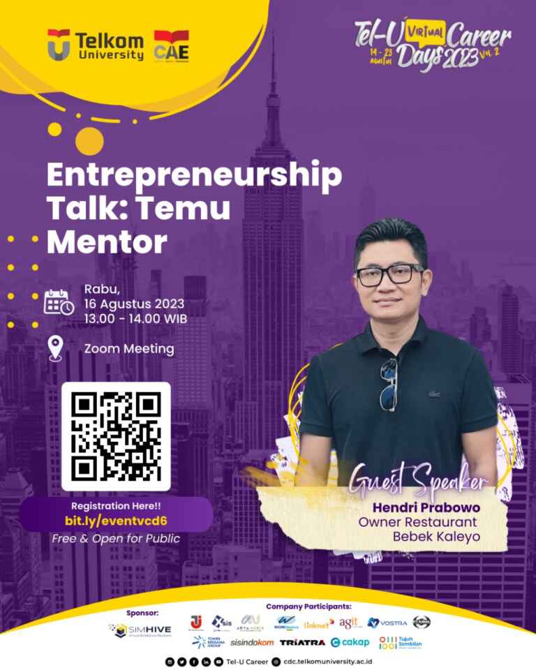 Yang mau jadi entrepreneur merapat. Di TUVCD ini akan ada tentang entrepreneurship dari alumni Tel-U yang juga seoramg entrepreneur sukses. Yuk ikutan!