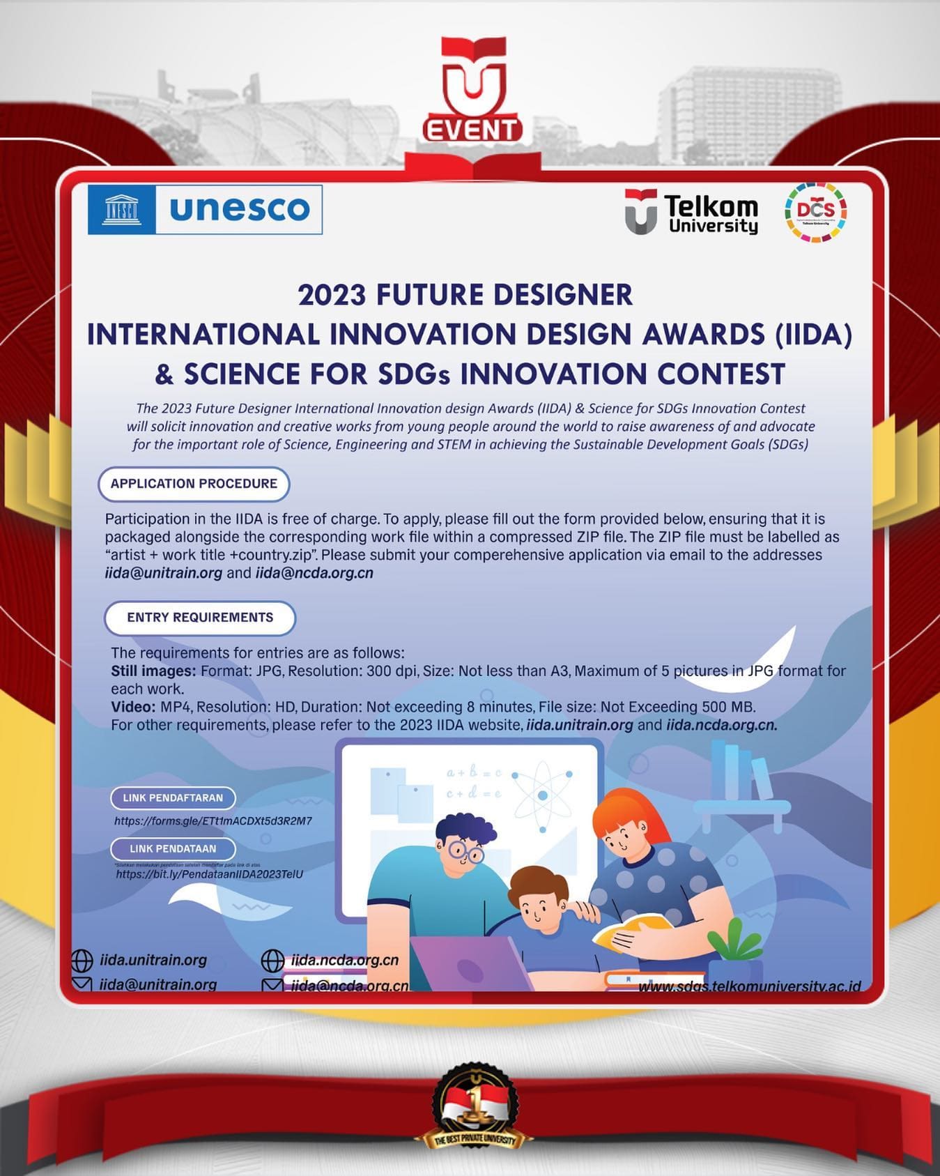 kami harap Mahasiswa dan Mahasiswi dapat menjadi perwakilan indonesia untuk 2023 International Innovation Design Awards & Science for SDGs Innovation Contest.