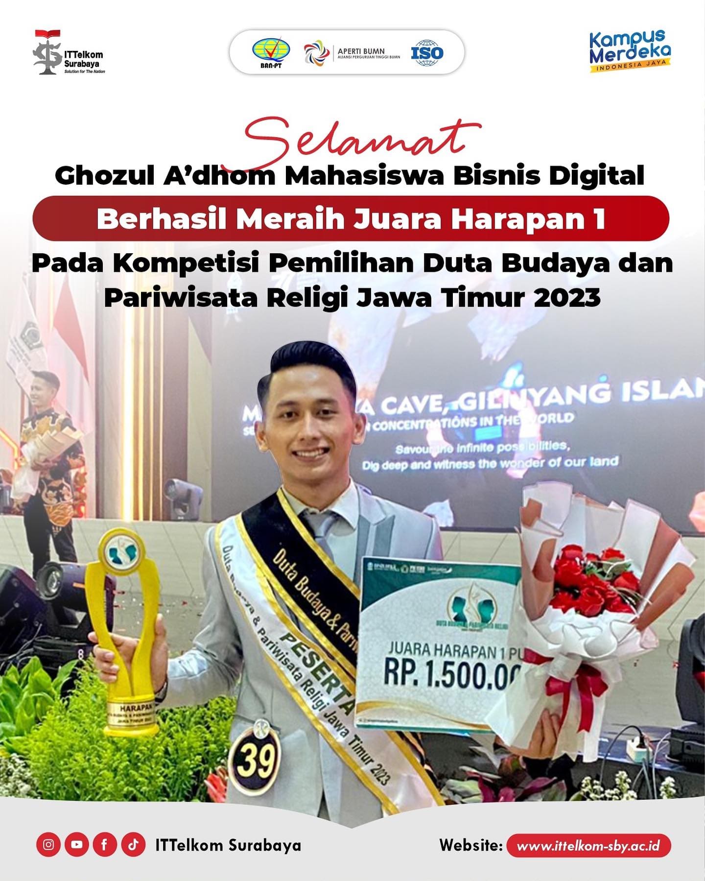 Selamat kepada mahasiswa Bisnis Digital @db.ittelkomsby Ghozul A’dhom!🏆 Kemenangan ini adalah prestasi yang membanggakan kampus kita. Dedikasimu dalam mempromosikan budaya dan pariwisata religi di Jawa Timur sangat menginspirasi kami🙌