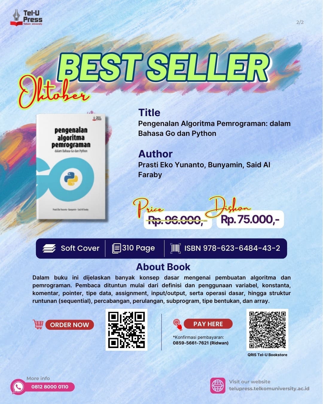“Buku terbaru Tel-U Press πŸ“šβœ¨ ‘Pengenalan Algoritma Pemrograman dalam Bahasa Go dan Python’ karya Prasti Eko Yunanto, Bunyamin, dan Said Al Faraby, menjadi buku terlaris bulan Oktober ini!! dan mencapai status “BEST SELLER”