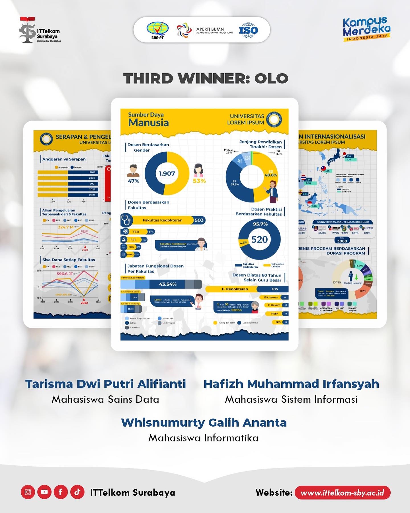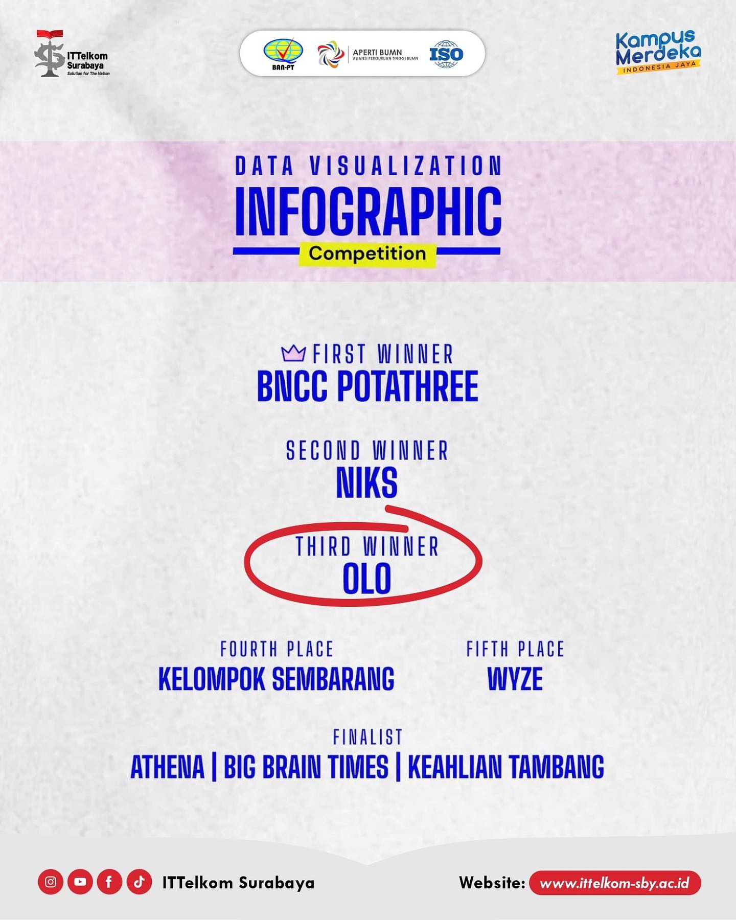Membanggakan! 3 mahasiswa berbakat ITTelkom Surabaya meraih Juara 3 dalam Kategori Data Visualization Infographics Competition pada Lomba Satu Data di Unair! @satudata.unair 👍
