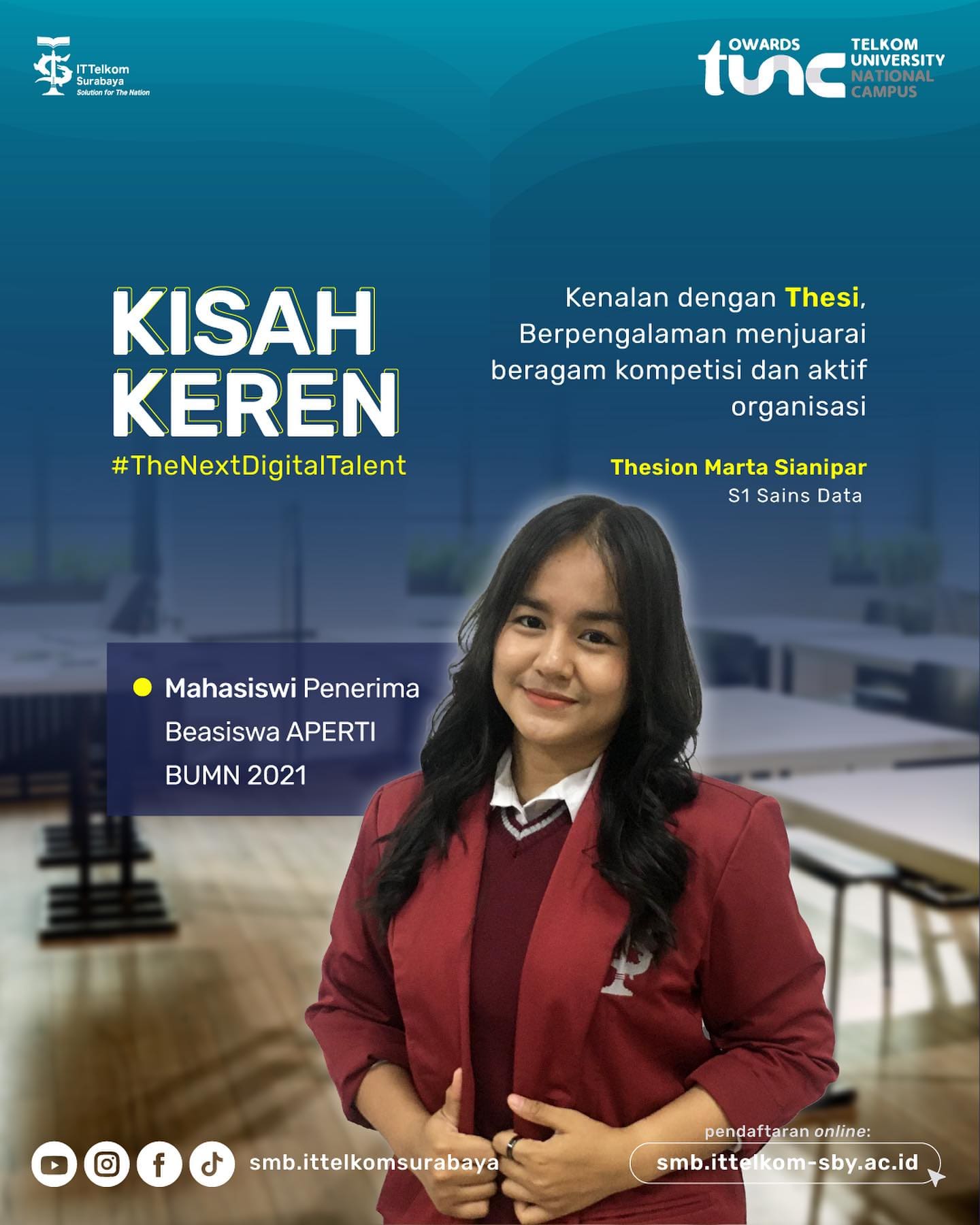 Penerima beasiswa APERTI BUMN 2021 dari program studi Sains Data @ds.ittelkomsby ini sudah memiliki beragam prestasi dan terus semangat untuk meraih prestasi-prestasi selanjutnya 🤓
