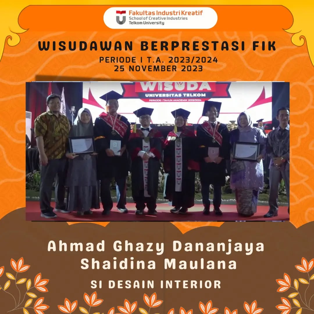 Selamat kepada Ahmad Ghazy Dananjaya dan Shaidina Maulana Wisudawan Prodi S1 Desain Interior sebagai Wisudawan Berprestasi FIK Periode I T.A. 2023/2024, 25 November 2023.