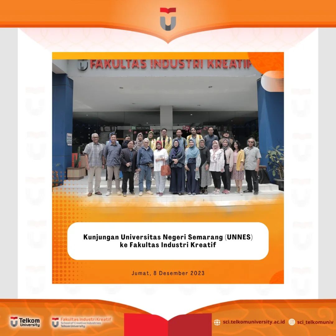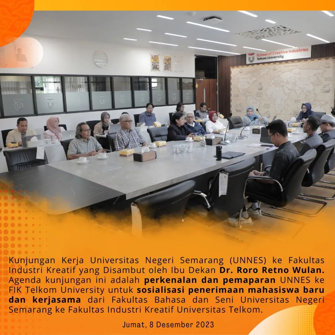 Kunjungan Kerja Universitas Negeri Semarang (UNNES) ke Fakultas Industri Kreatif yang Disambut oleh Ibu Dekan Dr. Roro Retno Wulan. Agenda kunjungan ini adalah perkenalan dan pemaparan UNNES ke FIK Telkom University untuk sosialisasi penerimaan mahasiswa baru dan kerjasama dari Fakultas Bahasa dan Seni Universitas Negeri Semarang ke Fakultas Industri Kreatif Universitas Telkom.