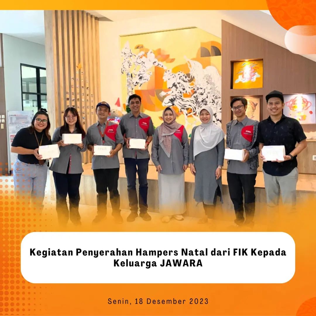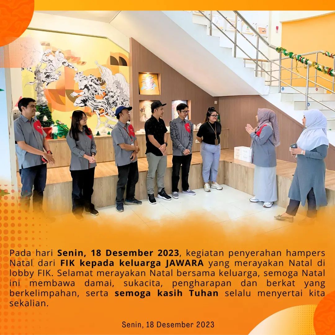 Pada hari Senin, 18 Desember 2023, kegiatan penyerahan hampers Natal dari FIK kepada keluarga JAWARA yang merayakan Natal di lobby FIK.