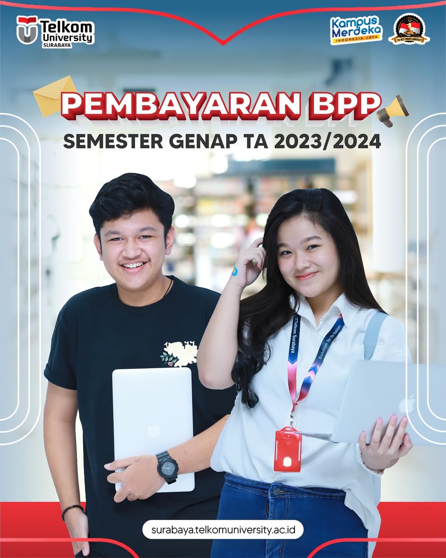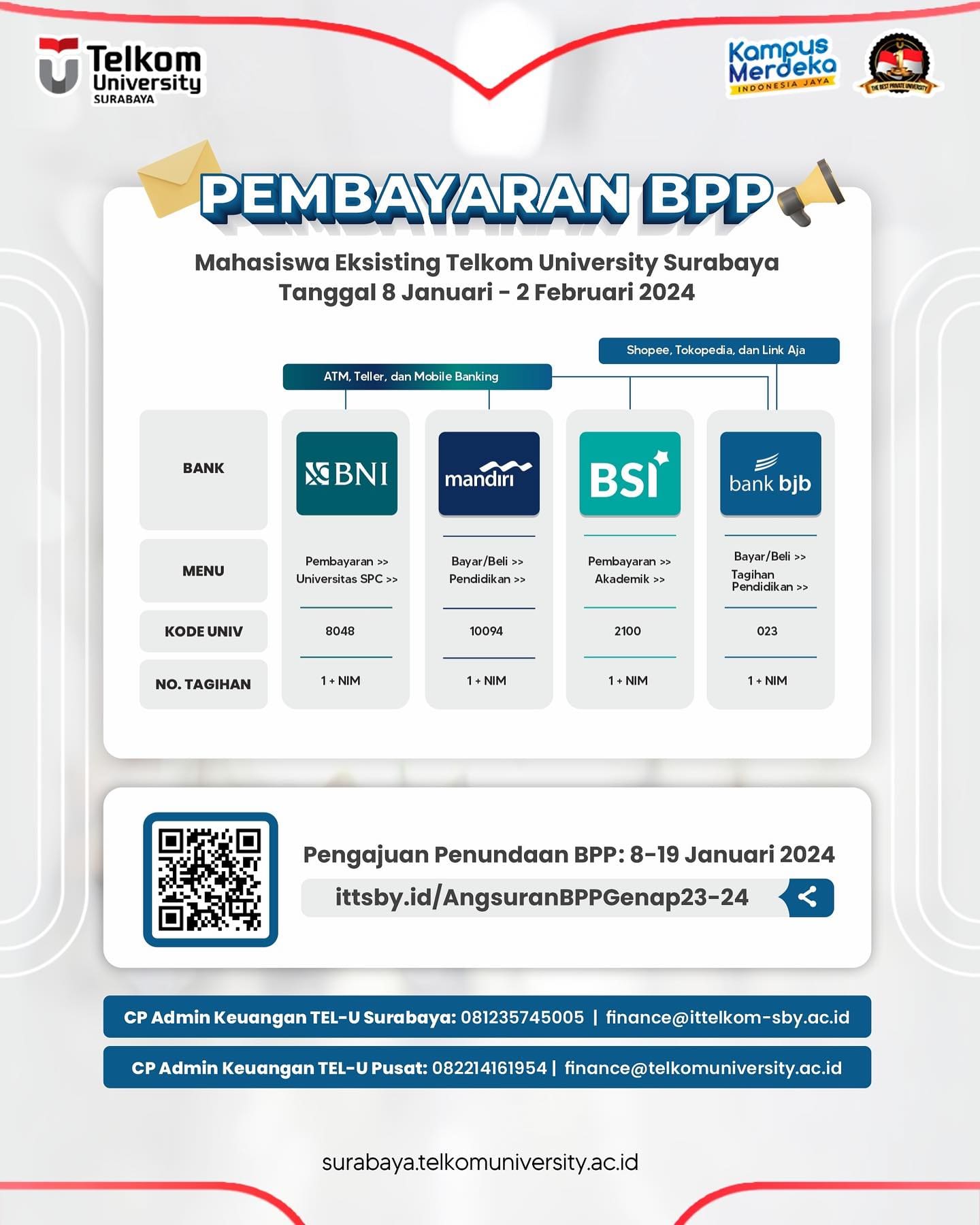 Untuk pertanyaan seputar pembayaran, bisa langsung ke Student Service Center @ssc.telkomsby di lantai 2 gedung kampus atau kontak Admin Keuangan ya 0812-3574-5005