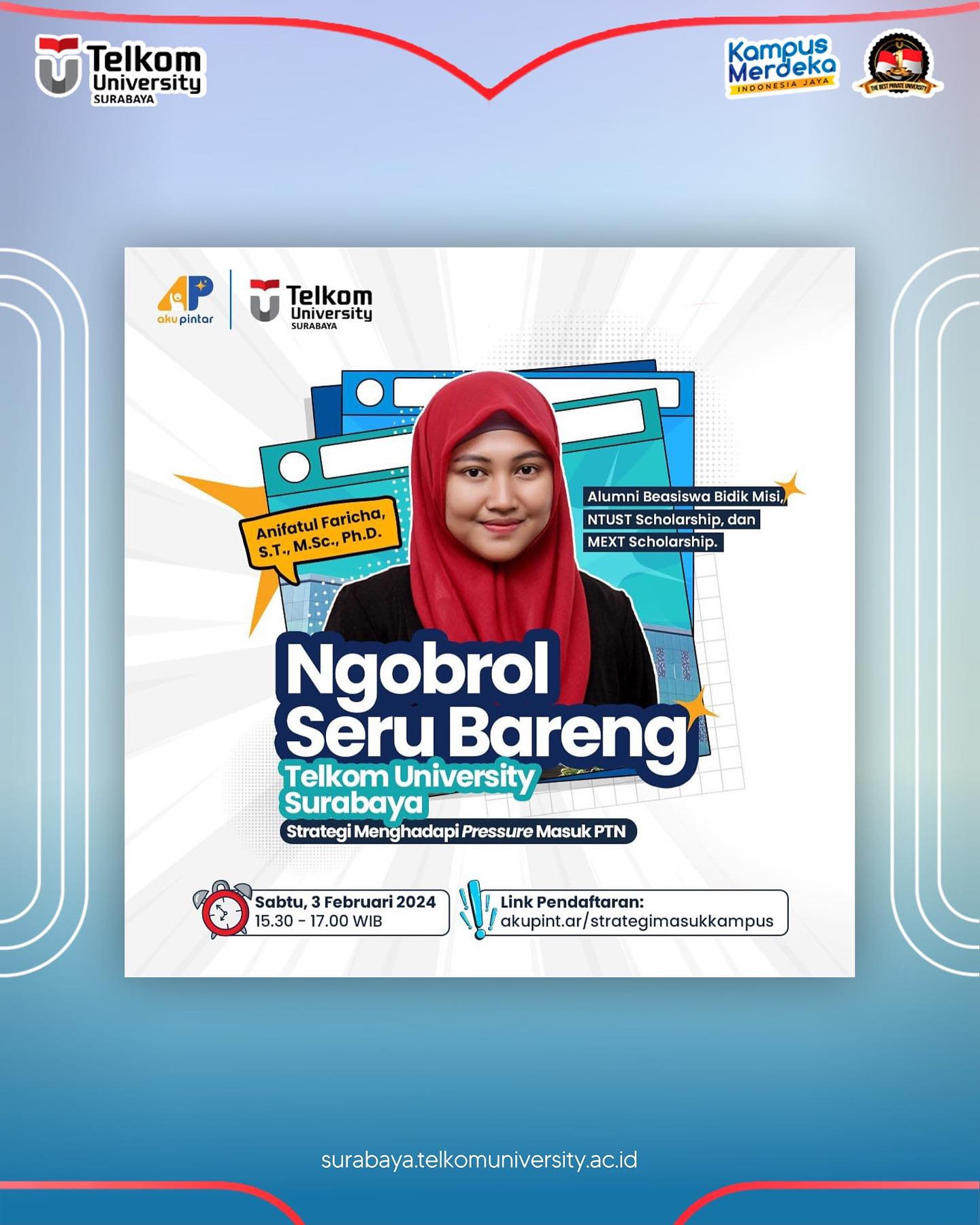Dosen berprestasi kami bu Ifa, akan membagikan wawasan berharga tentang menghadapi pressure masuk PTN dan tips memilih PTS yang tepat bersama @akupintar.id 📚✨ Jangan lewatkan kesempatan emas ini untuk mendapatkan pengetahuan dan membuat keputusan yang tepat!