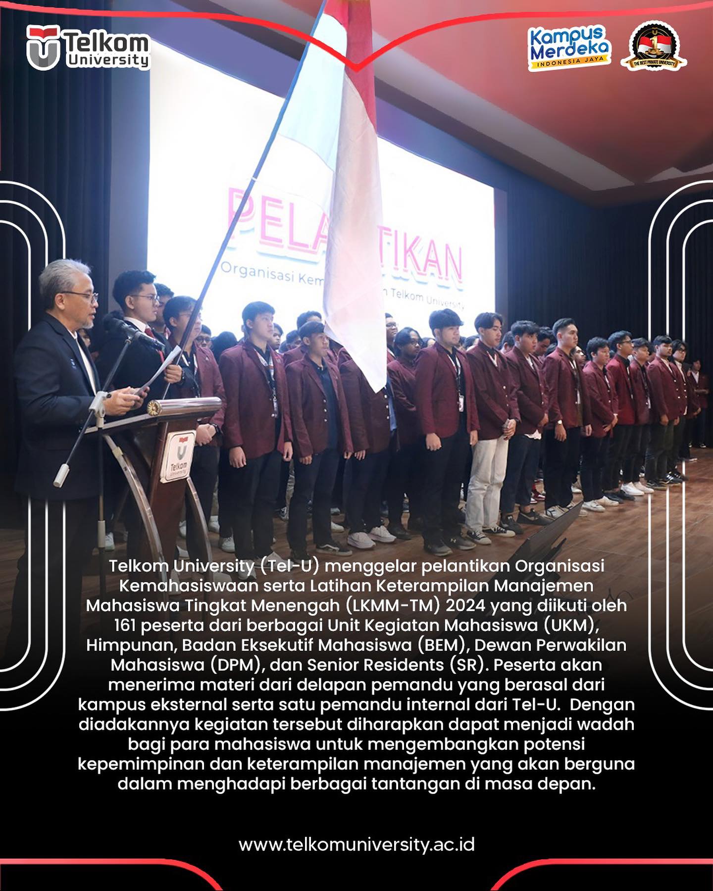 Jumat, 16 Februari 2024, Telkom University Gelar Pelantikan Organisasi Kemahasiswaan dan LKMM-TM 2024. Tujuan dari digelarnya acara tersebut sebagai bentuk dari Telkom University dalam mengembangkan potensi kepemimpinan dan keterampilan manajemen dengan melakukan pembekalan kepada para ketua organisasi mahasiswa (Ormawa) agar memiliki kemampuan memimpin serta mampu membentuk dan mengembangkan organisasi dengan baik.