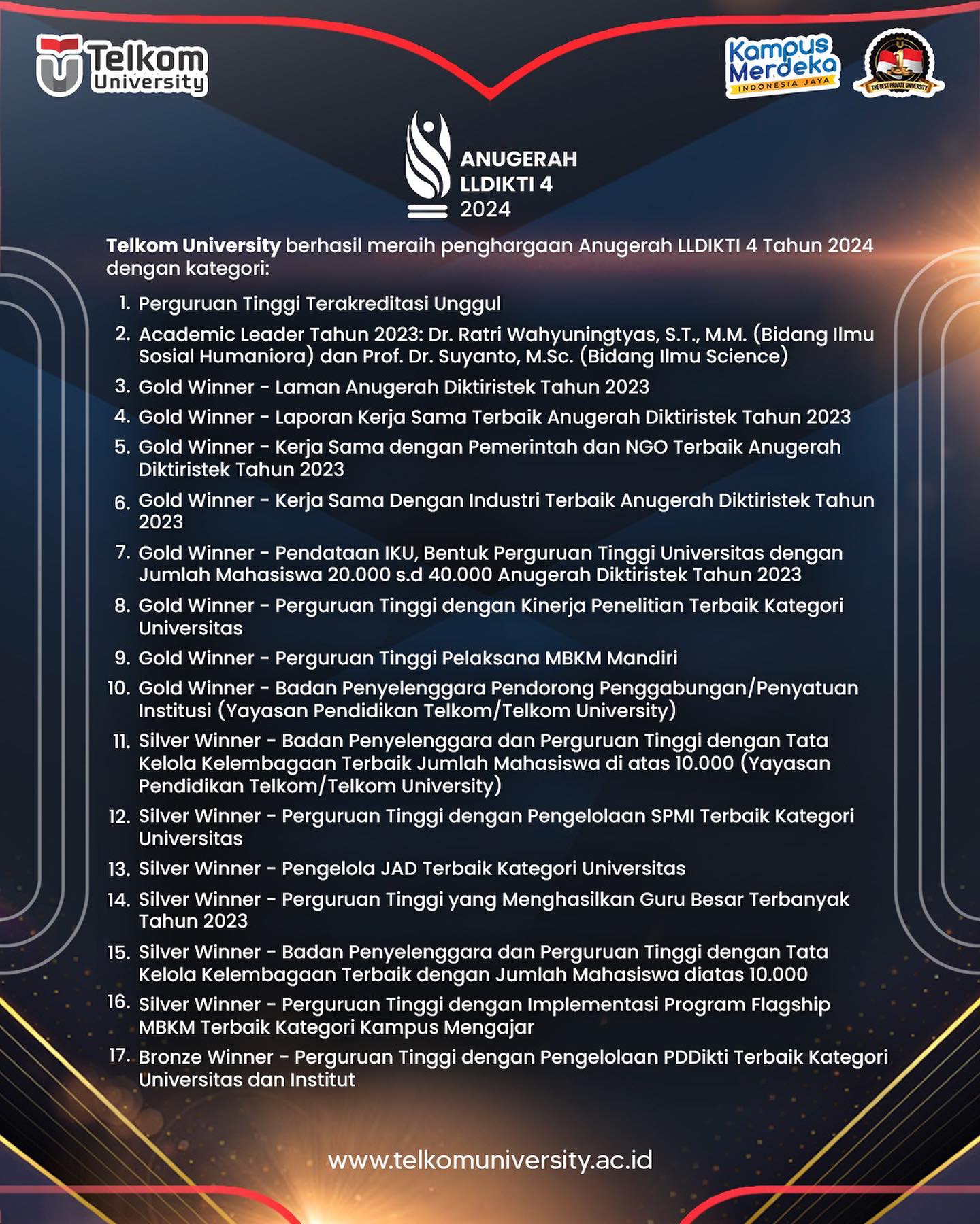 Telkom University berhasil memborong 17 Penghargaan Anugerah LLDIKTI Wilayah 4 Tahun 2024