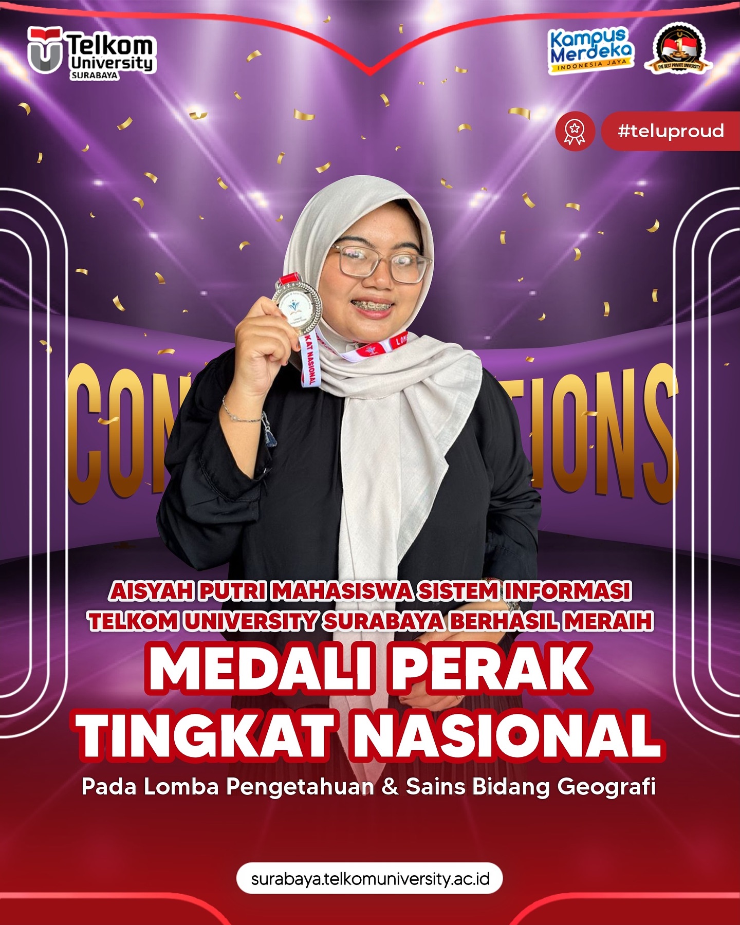 Aisyah Putri Amni Ramadhanti, mahasiswa S1 Sistem Informasi angakatan 2021, telah mengukir prestasi gemilang dengan meraih Medali Perak pada Lomba Pengetahuan dan Sains Indonesia tingkat Nasional di bidang Geografi!