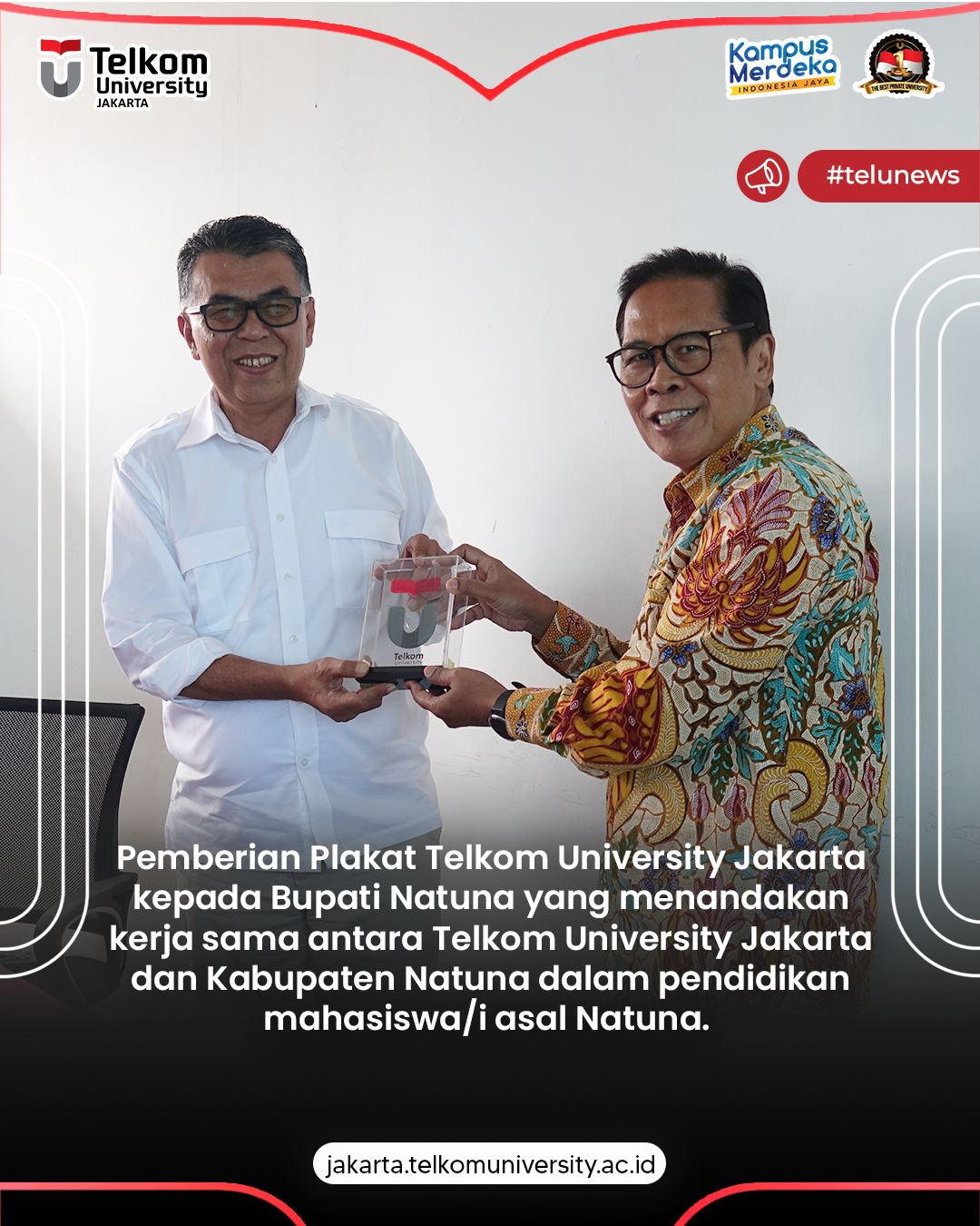 Kegiatan kunjungan Bupati Natuna ke Kampus 2 Universitas Telkom Jakarta dalam rangka monitoring dan evaluasi mahasiswa/i asal Natuna sebagai penerima beasiswa dari Univeritas Telkom.