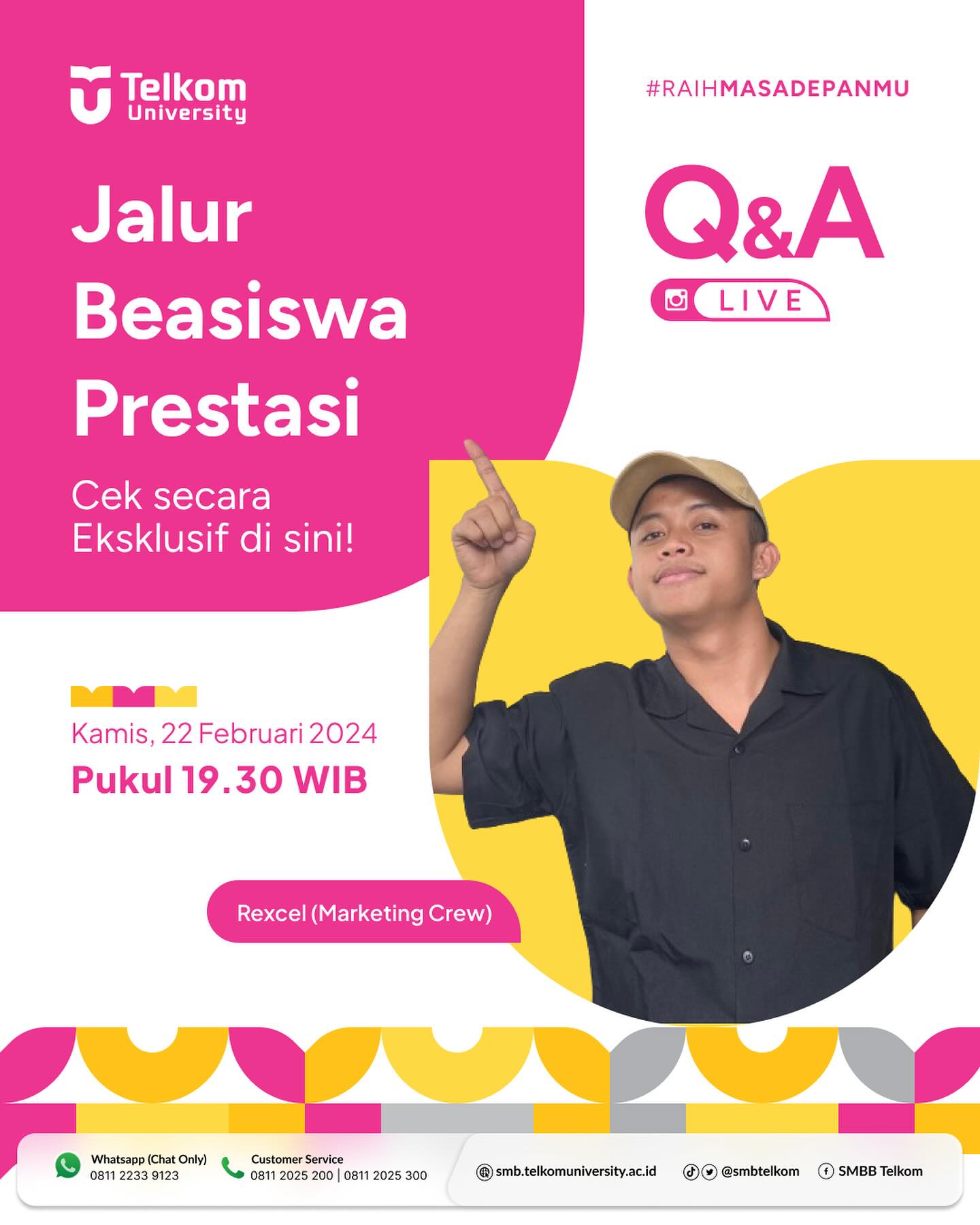 Buat yang masih belum mendaftar atau yang pengen ngobrol seputar jalur masuk di @telkomuniversity, yuk nonton Q&A Live kita jam 19.30 ya β¨