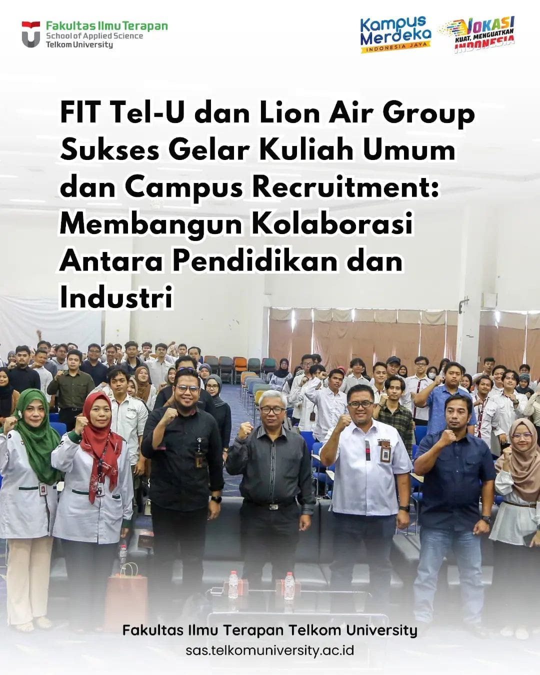 Fakultas Ilmu Terapan (FIT) Telkom University (Tel-U) bersama Lion Air Group telah berhasil menyelenggarakan acara kuliah umum dan campus recruitment yang bertujuan untuk membangun kolaborasi yang erat antara dunia pendidikan dan industri. Kegiatan ini dilaksanakan dengan sukses di Aula Fakultas Ilmu Terapan Tel-U pada tanggal 20 – 22 Februari 2024.