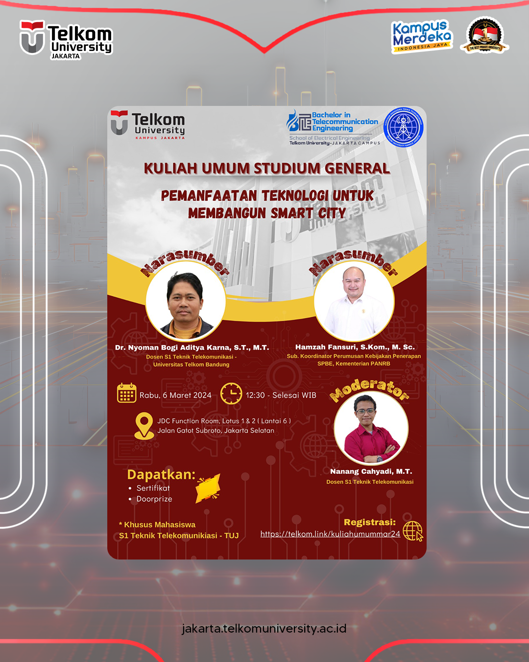 S1 Teknik Telekomunikasi Universitas Telkom Kampus Jakarta akan mengadakan Kuliah Umum dengan topik “Pemanfaatan Teknologi untuk Membangun Smart City”.