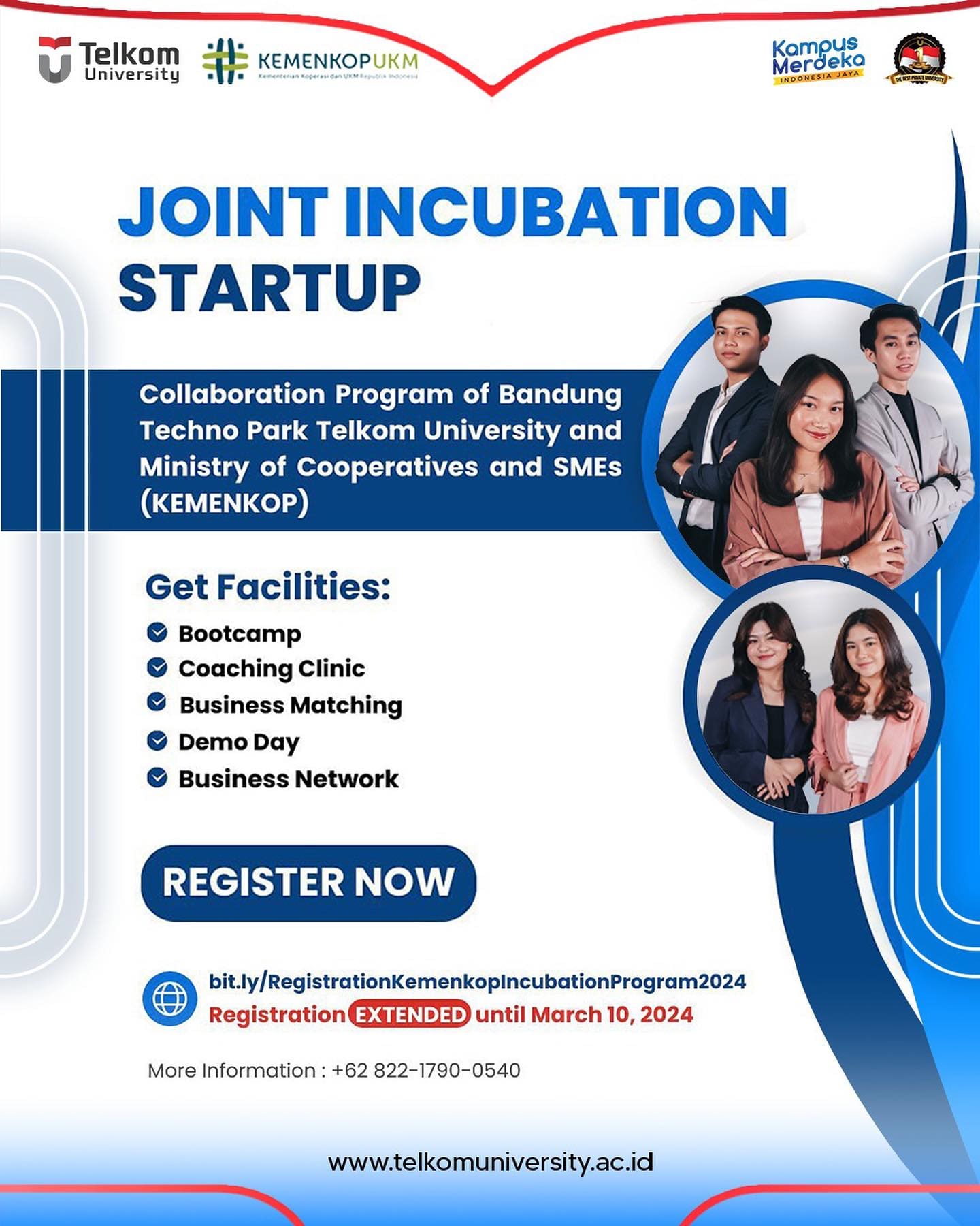 Exciting news for aspiring entrepreneurs! The collaboration program between Bandung Techno Park Telkom University and the Ministry of Cooperatives and SMEs (KEMENKOP) is now open for the 2024 period. This program offers a unique opportunity for startups to thrive with a range of beneficial facilities and support.