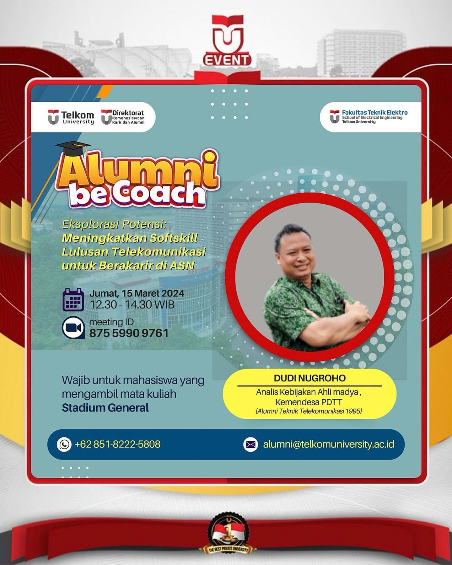 Direktorat Kemahasiswaan, Karir dan Alumni berkolaborasi dengan Fakultas Teknik Elektro khususnya prodi S1 Teknik Telekomunikasi dalam kegiatan Alumni Be Coach bersama pemateri yaitu salah satu alumni Telkom University S1 Teknik Telekomunikasi 1995, Pak Dudi Nugroho yang merupakan Analis Kebijakan Ahli madya , Kemendesa PDTT.