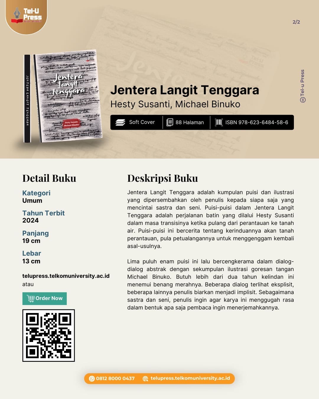 Selamat Hari Puisi Sedunia!📖✨Merayakan keindahan kata-kata dan kekuatan imajinasi dengan kumpulan puisi dalam buku ‘Jentera Langit Tenggara’ dari Tel-U Press. Menyajikan perjalanan batin Hesty Susanti dalam puisi-puisi yang sarat akan kerinduan dan petualangan, serta dialog abstrak yang terjalin dengan indah bersama ilustrasi goresan tangan Michael Binuko. Jelajahi keunikan dan keindahan sastra dalam setiap halamannya. 📖✨