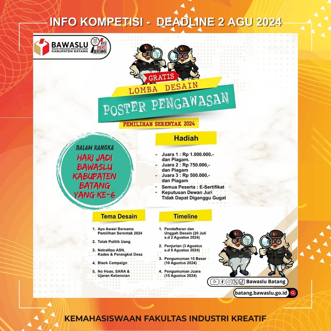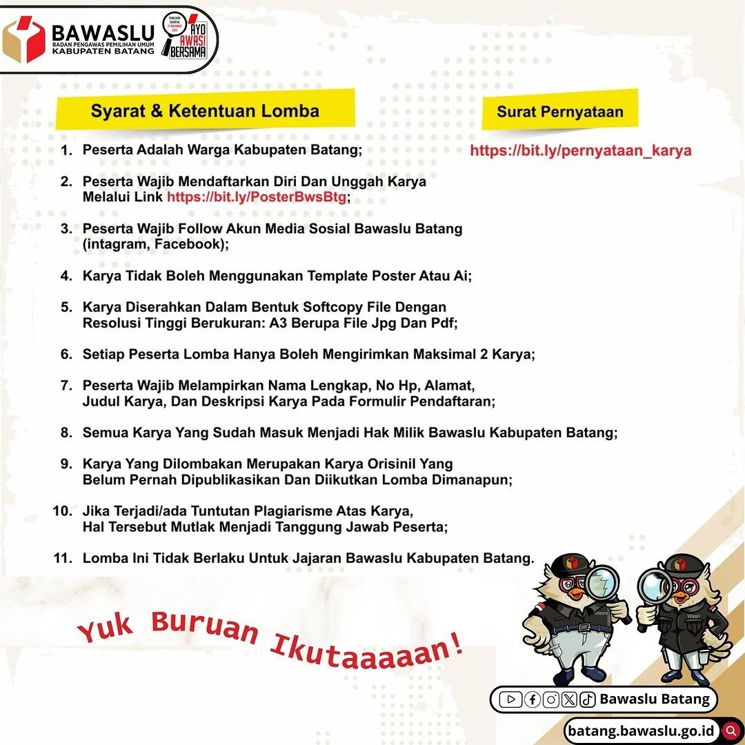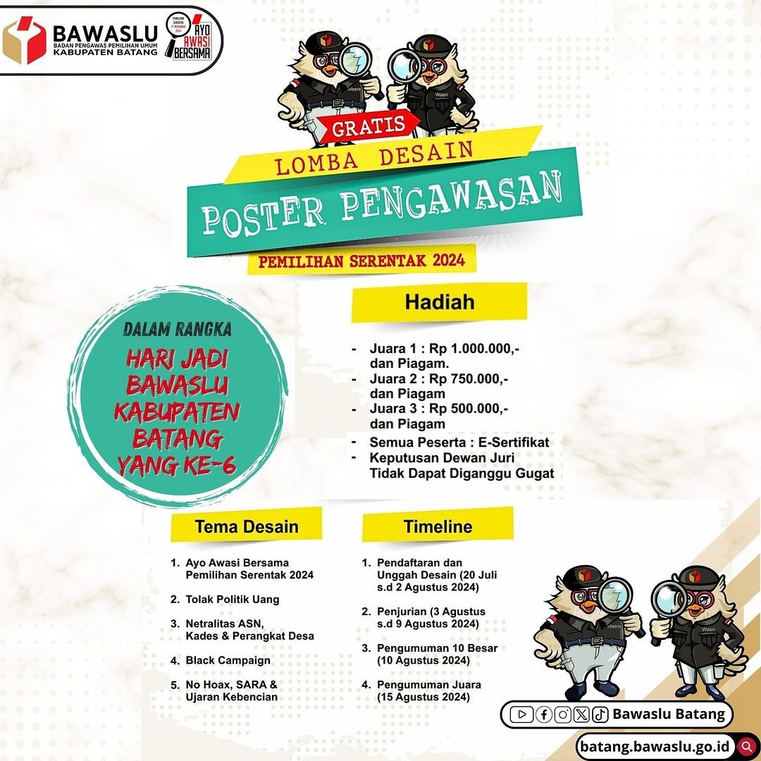 dalam rangka Hari Jadi Bawaslu Kabupaten Batang Yang Ke-6, Bawaslu Batang buka Lomba Desain Poster Pengawasan Pemilihan Serentak 2024, Yuk Ikutan dan dapatkan hadiahnya.