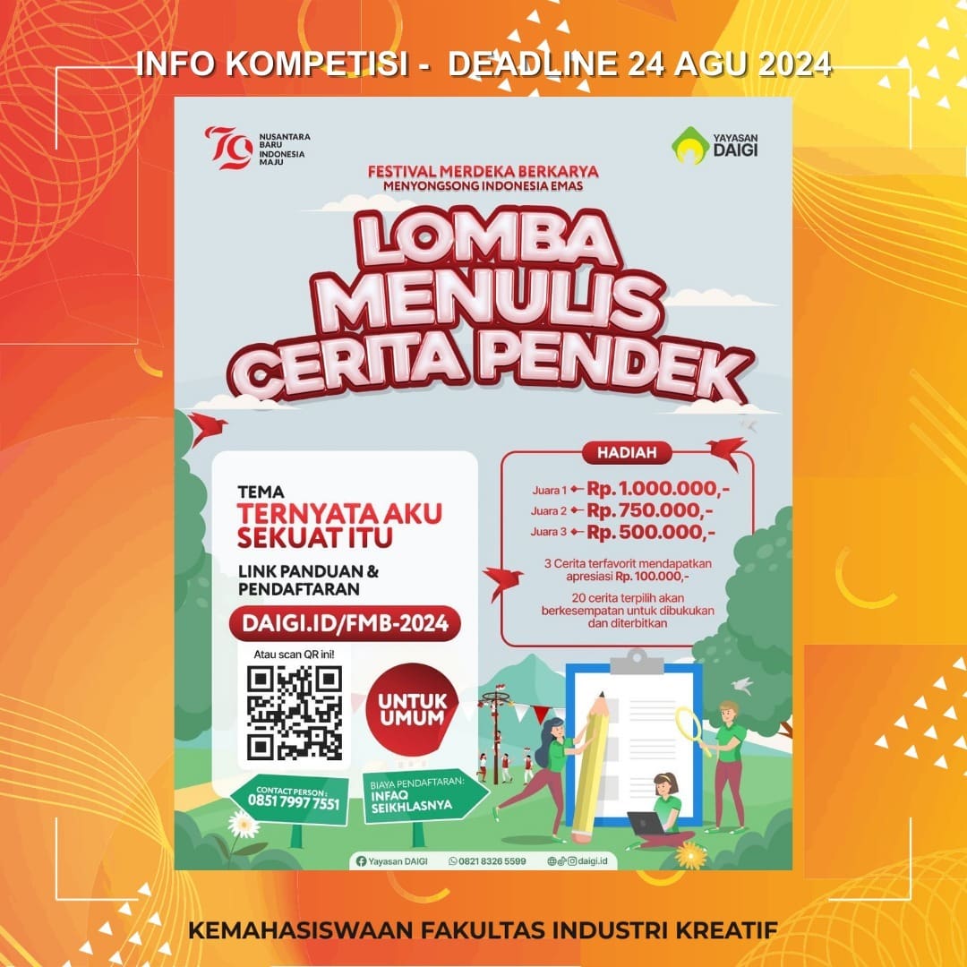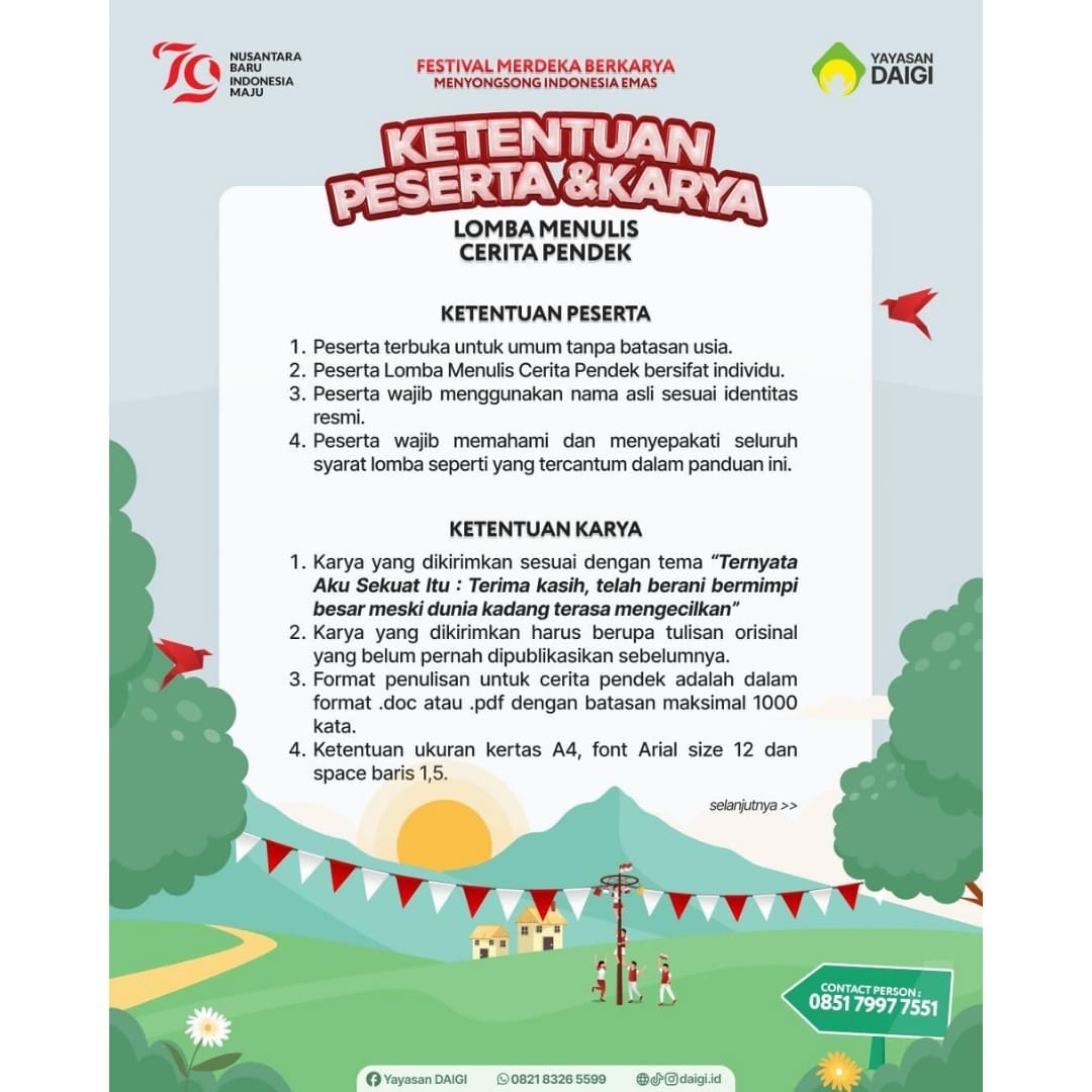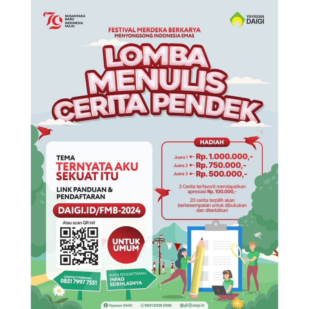 Yayasan Duta Amal Gemilang Indonesia (DAIGI) dengan bangga mengundang seluruh penulis untuk berpartisipasi dalam Lomba Menulis Cerita Pendek. Mari bergabung dalam perayaan online yang penuh semangat mulai 27 Juli – 24 Agustus 2024.