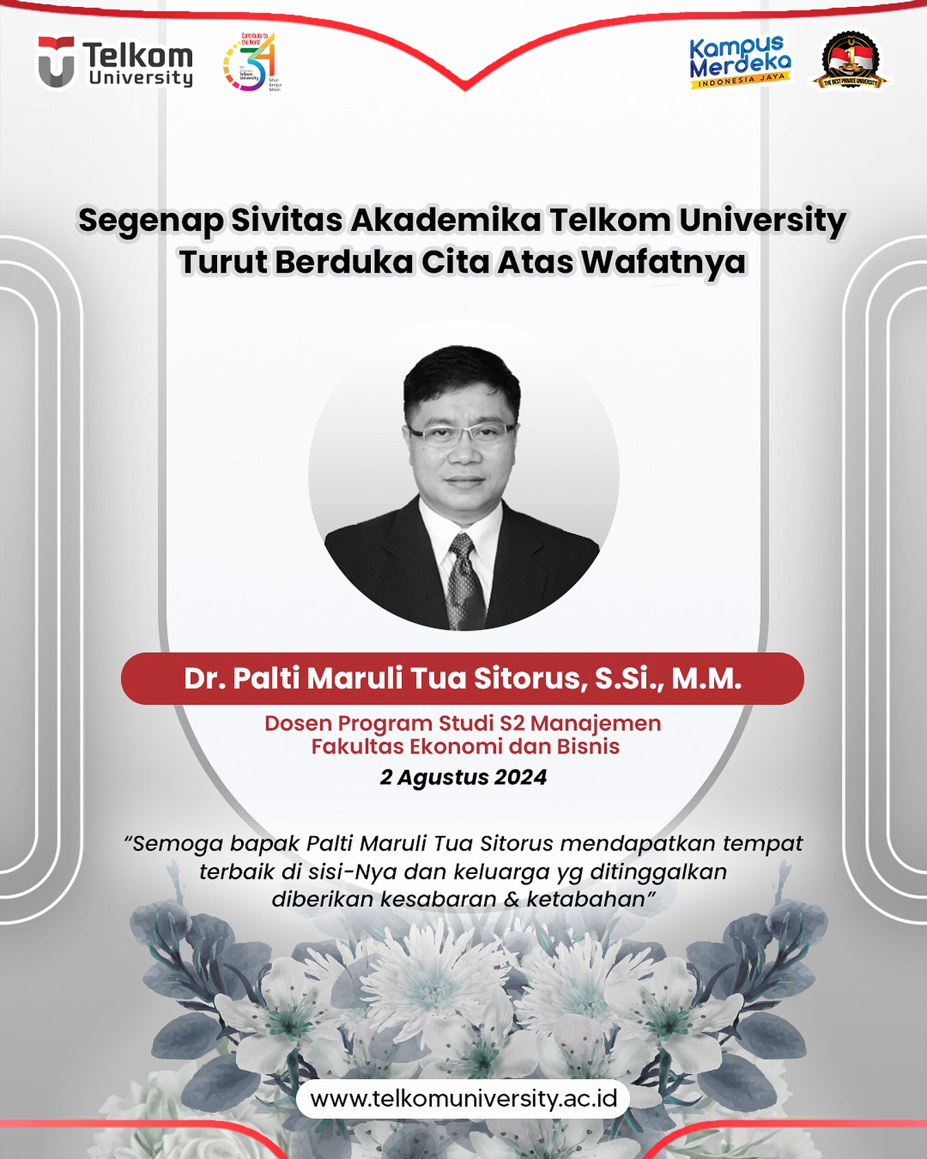 Segenap Sivitas Akademika Telkom University mengucapkan turut berduka cita atas berpulangnya Dr. Palti Maruli Tua Sitorus. Semoga dapat tempat terbaik di Sisinya.