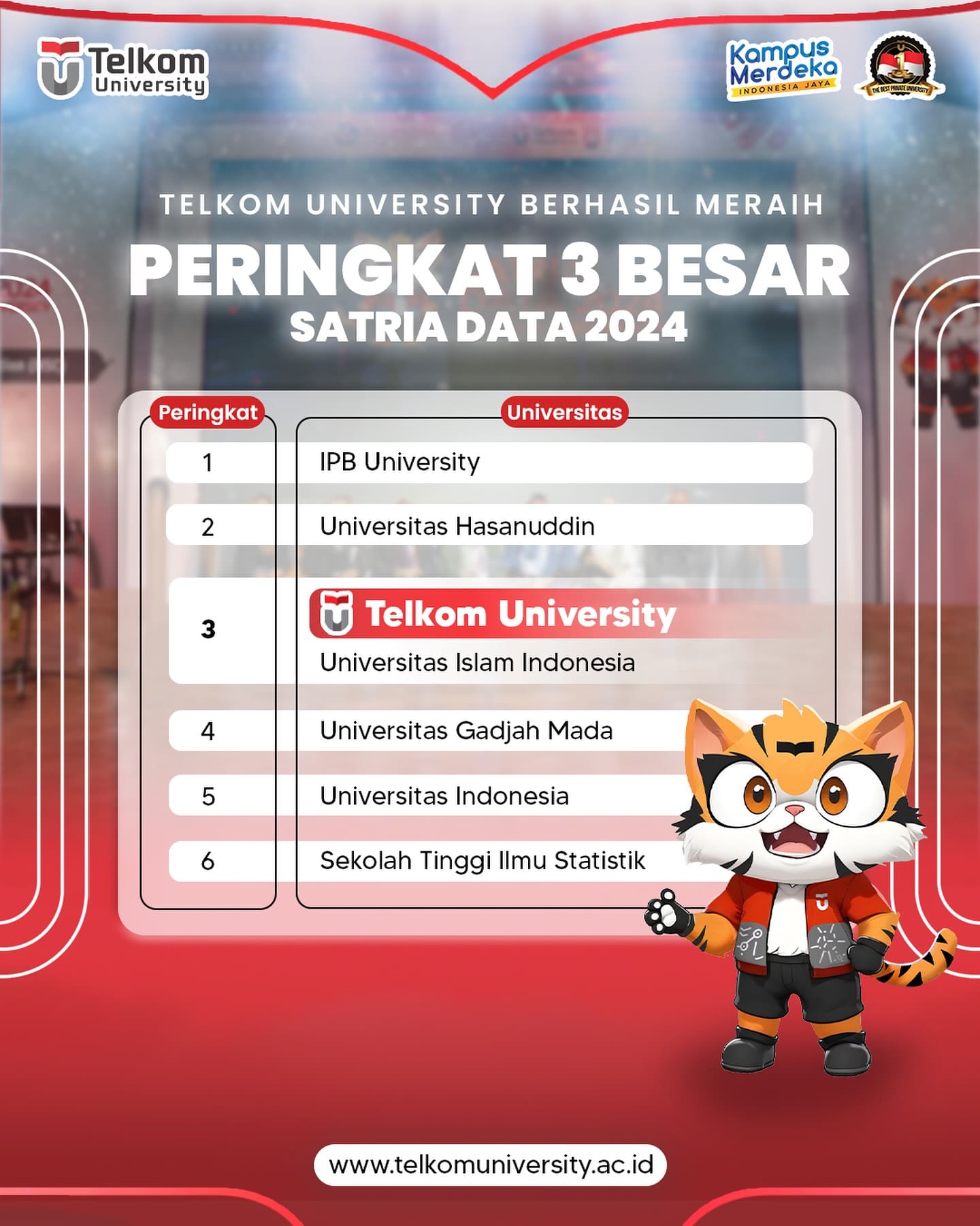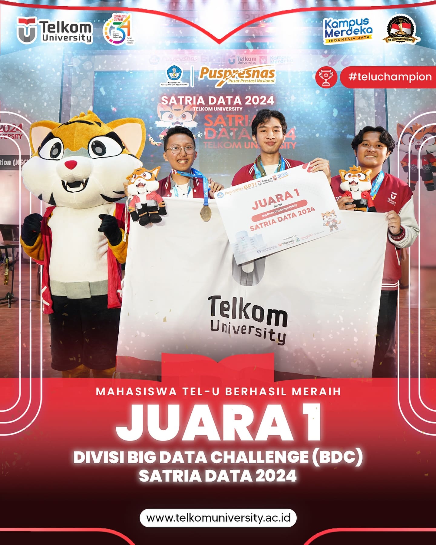 HEI TelUtizen! Dalam Lomba Satria Data 2024, Mahasiswa Telkom University berhasil meraih berbagai penghargaan, yaitu Juara 1 Kategori Big Data Challenge (BDC), Muhammad Naufal Hawari (S1 Informatika), Agung Hadi W (S1 Data Sains), Prins Naval Nuzeren (S1 Informatika), Best Presentation Kategori Statistics Infographic Competition (SIC) Wanda Azizah (S1 Data Sains), Aqiela Putriana (S1 Data Sains), Siti Nurafifa Zainul (S1 Data Sains), dan Tel-U menduduki peringkat 3 besar loh!
