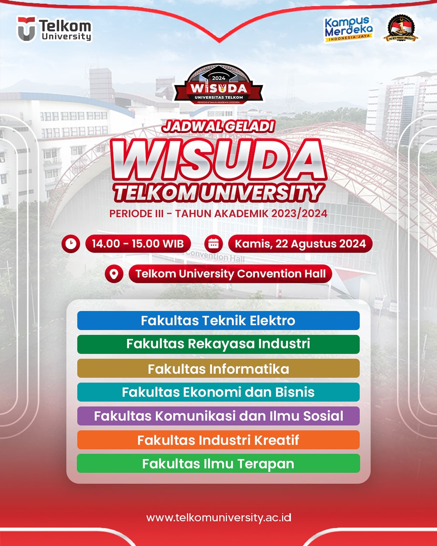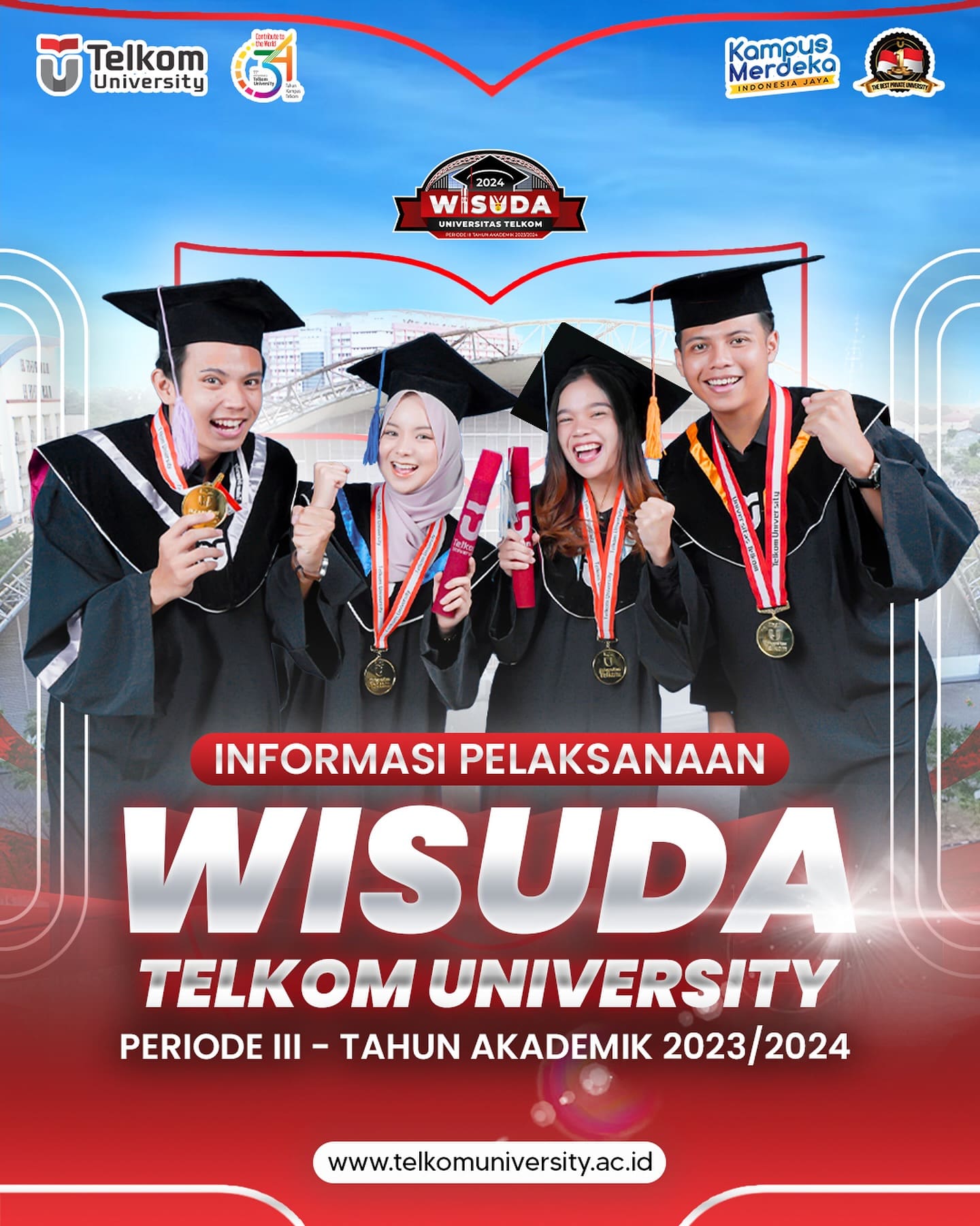 HEI TelUtizen! Siapa yang sudah engga sabar untuk melaksanakan wisuda? Nah, berikut informasi terkait Wisuda Telkom University Periode III Tahun Akademik 2023/2024 yang akan dilaksanakan di Telkom University Convention Hall