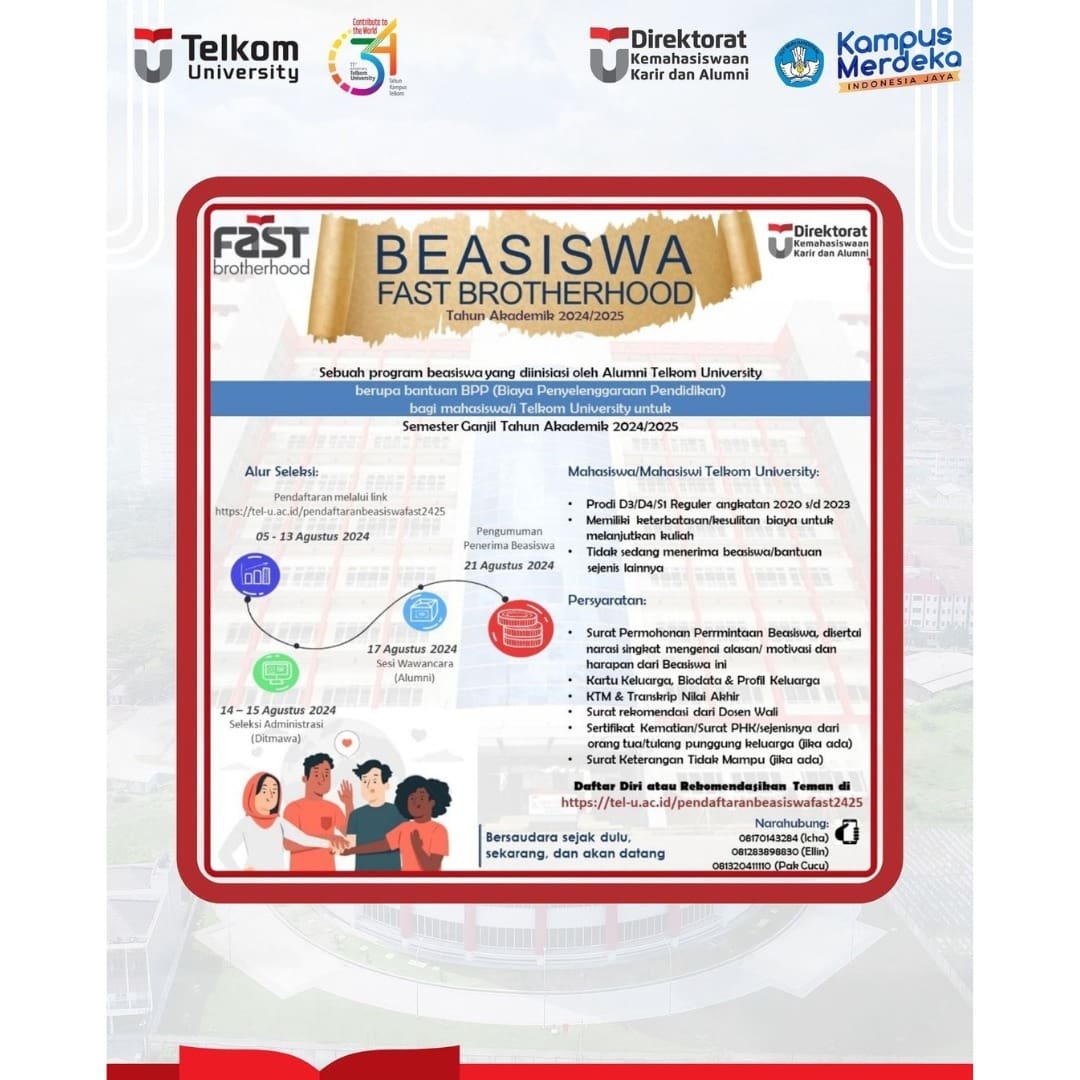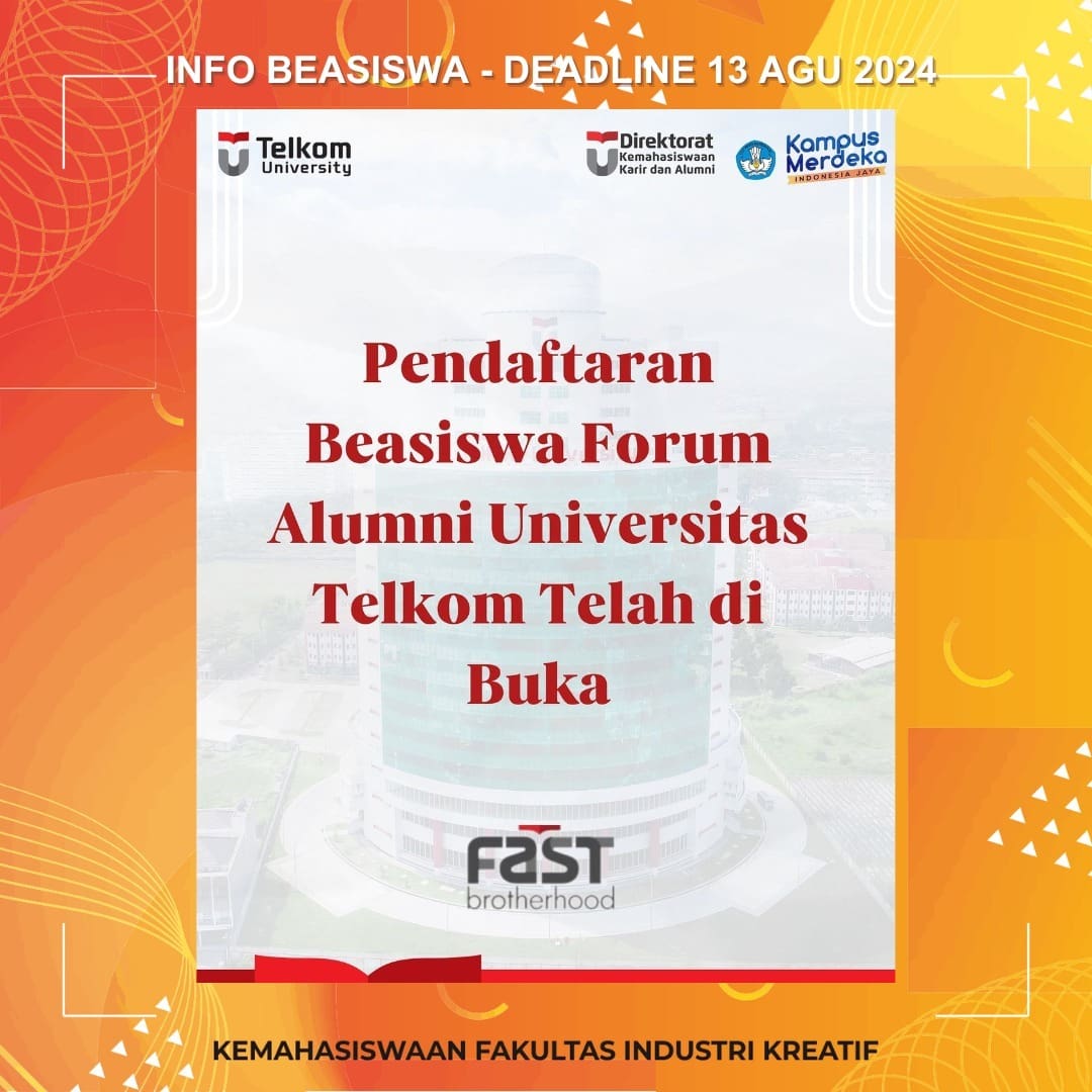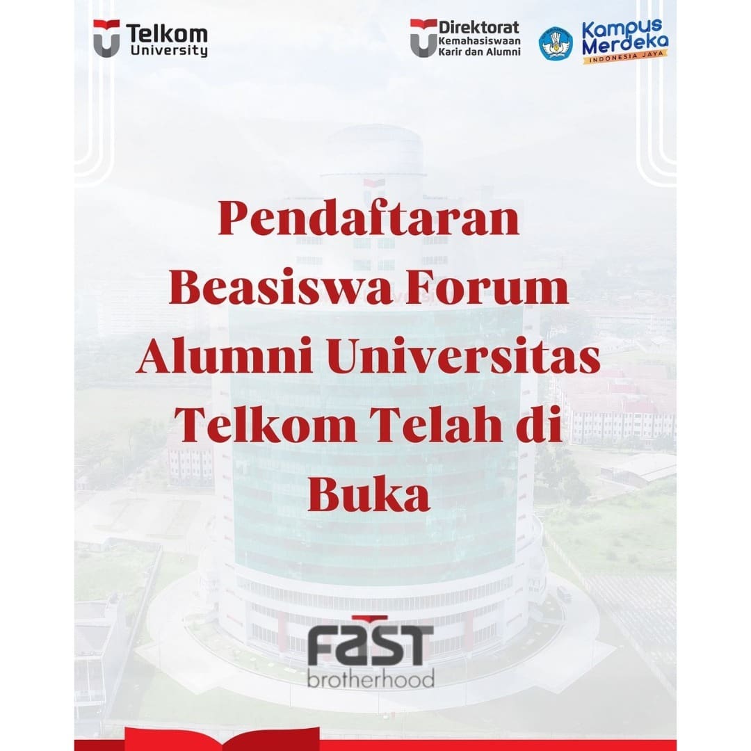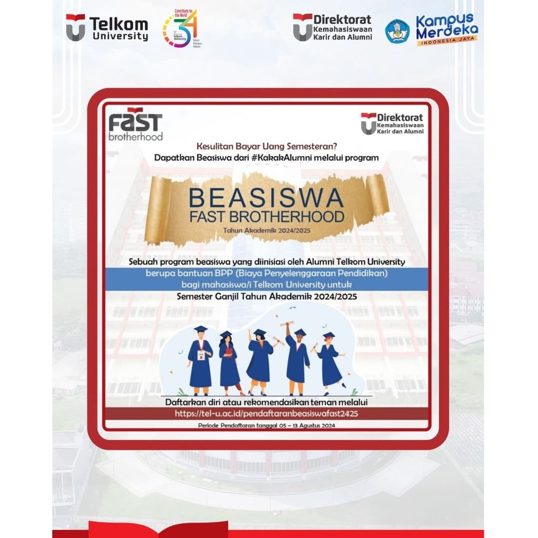 # KakakAlumni FAST Brotherhood bekerja sama dengan Direktorat Kemahasiswaan Tel-U akan membuka pendaftaran βBeasiswa FAST Brotherhood β bagi mahasiswa Universitas Telkom yang memiliki keterbatasan biaya kuliah semester Ganjil Tahun Akademik 2024/2025