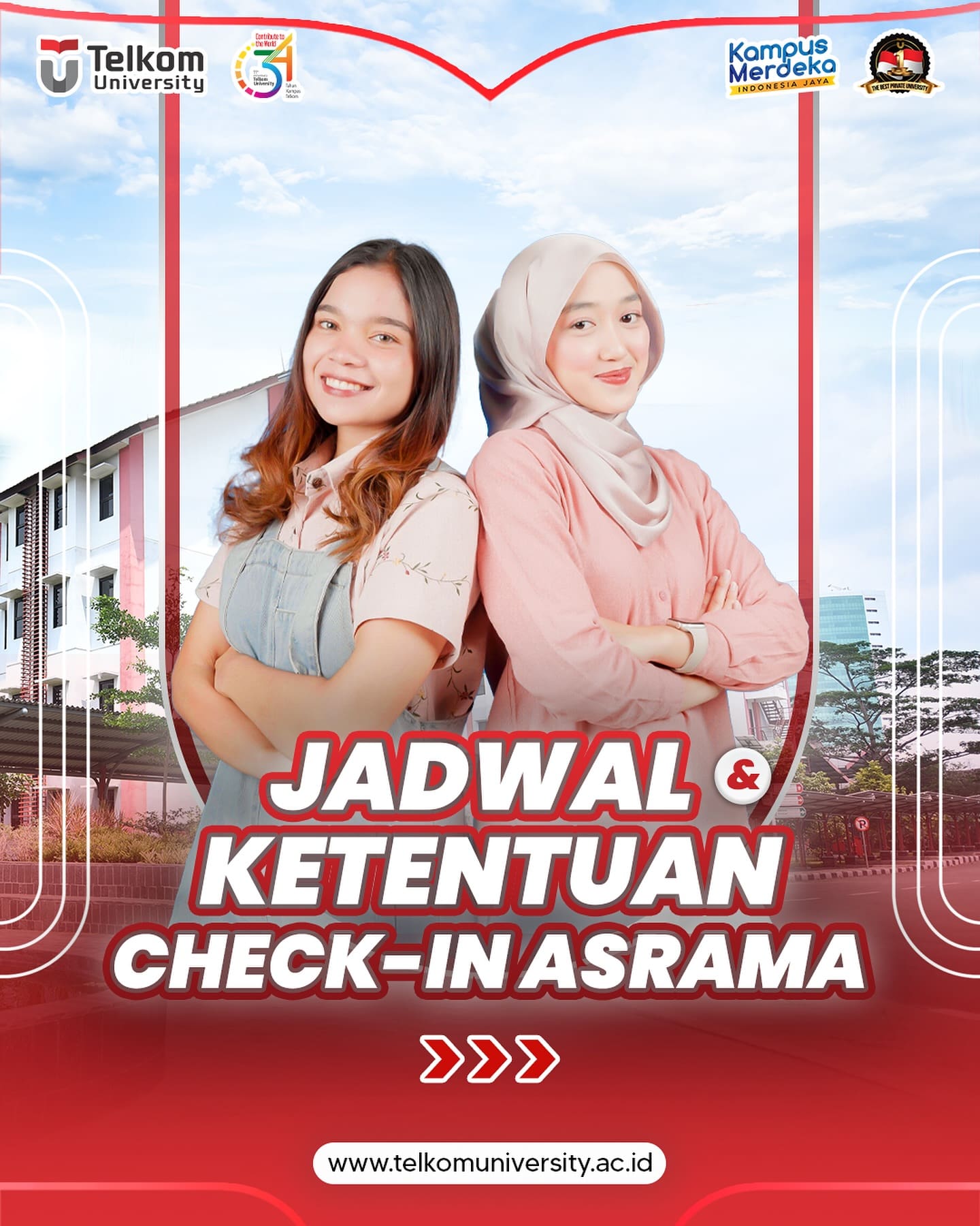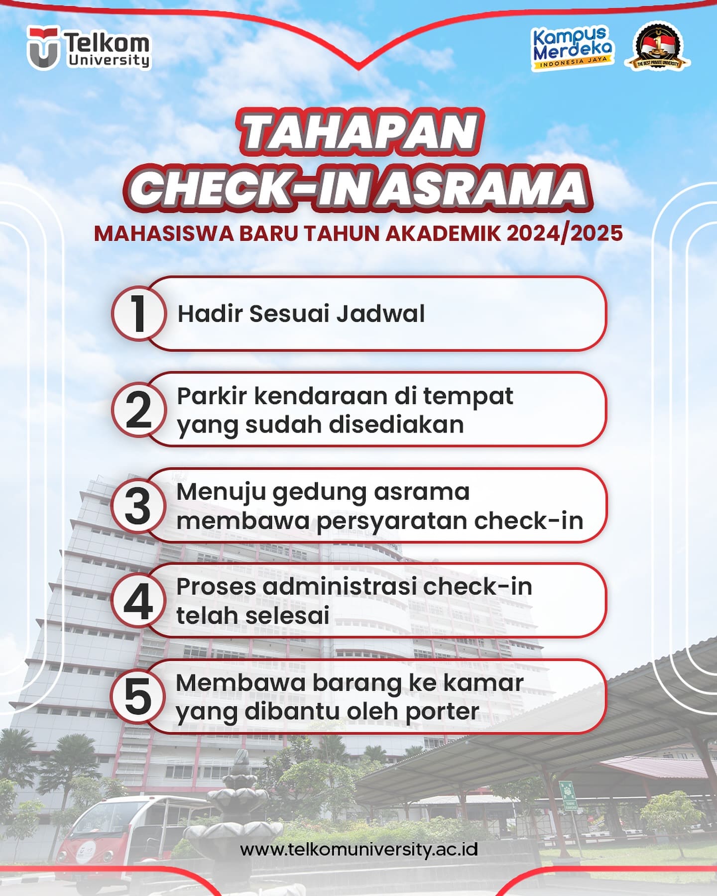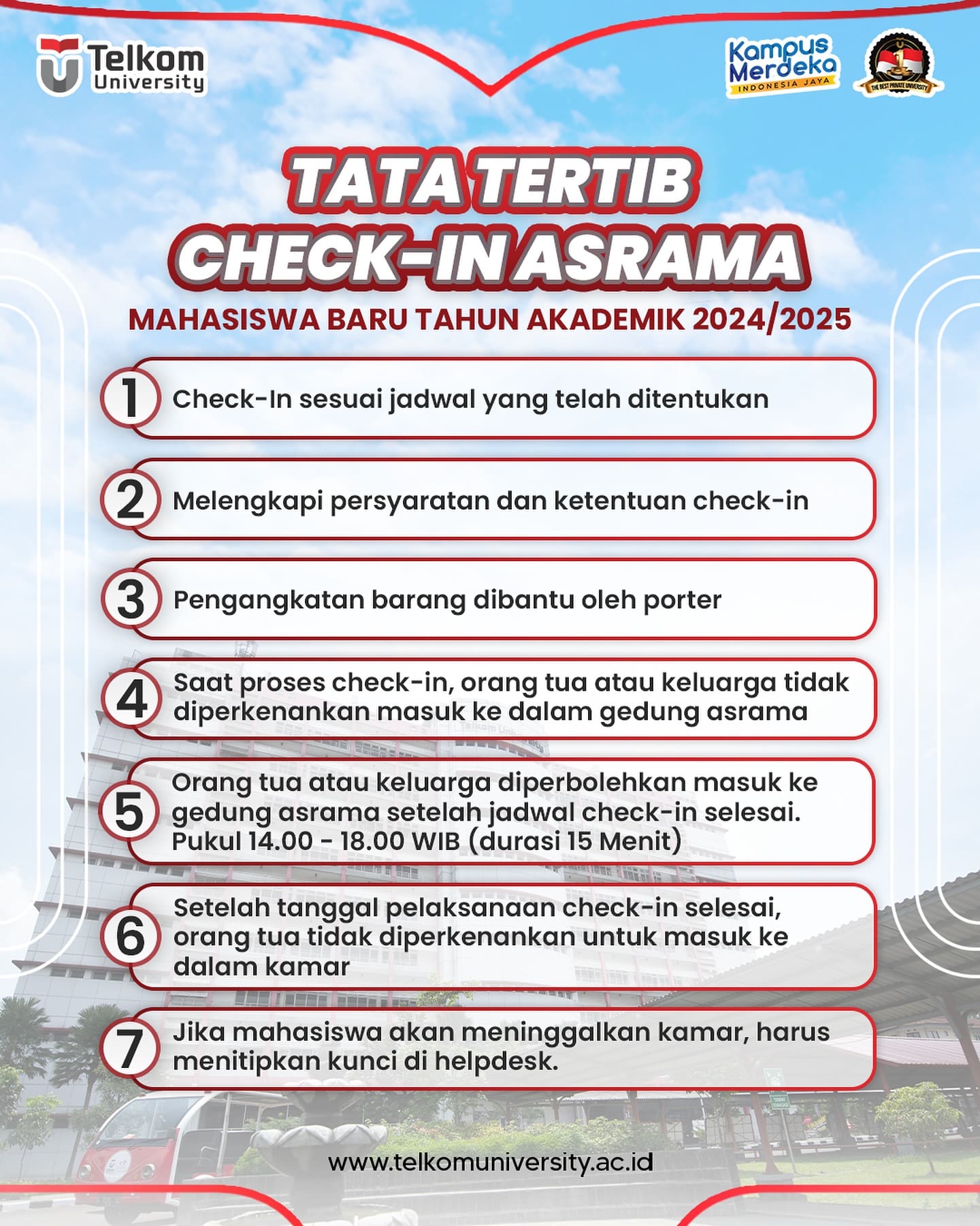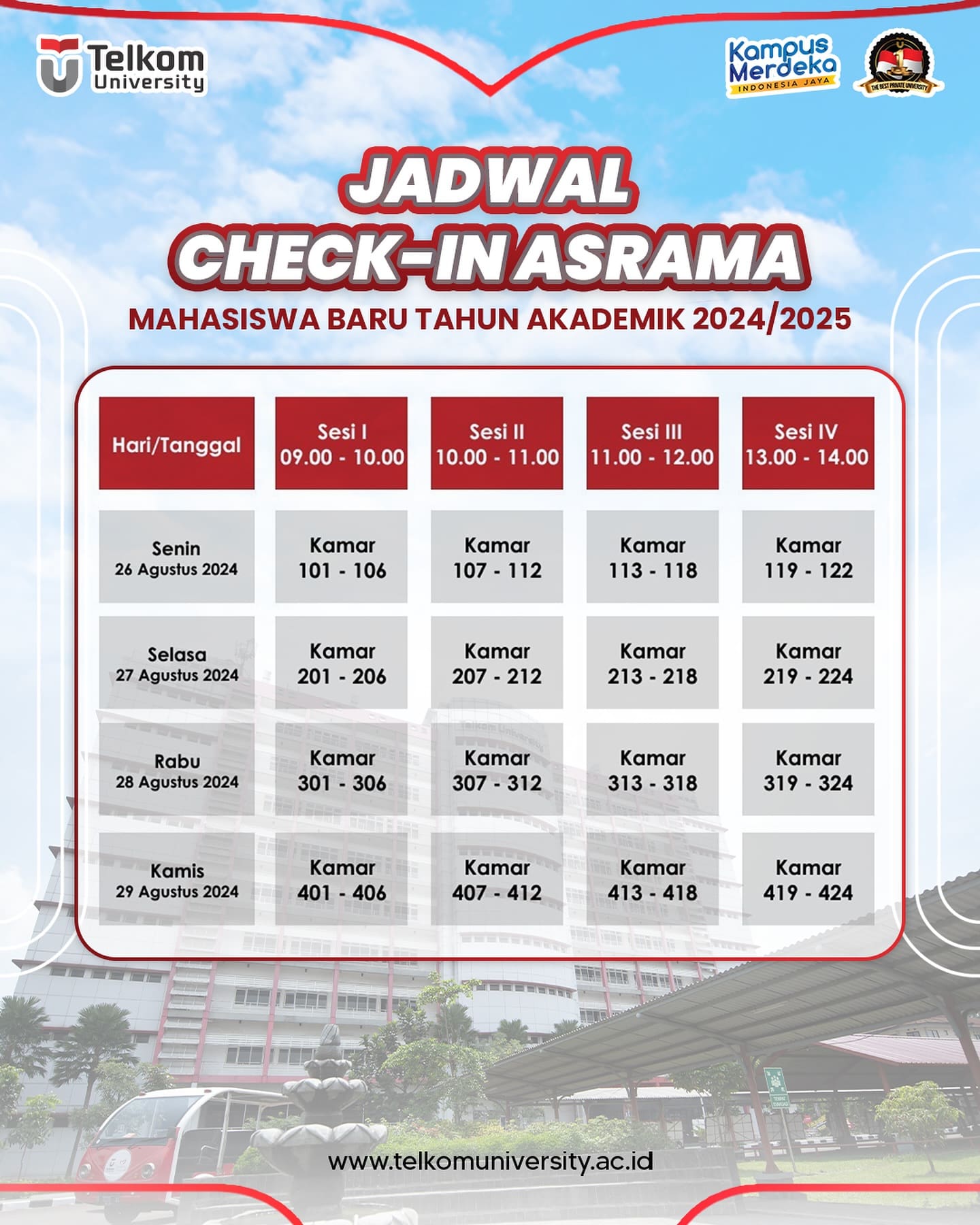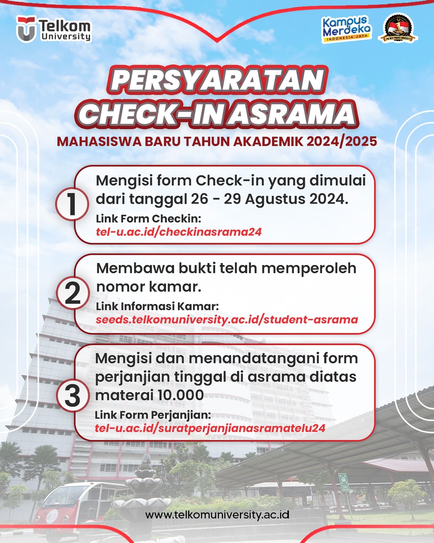 HEI TelUtizen! Check-in Asrama Mahasiswa Baru Tahun Akademik 2024/2025 akan dilaksanakan mulai tanggal 24-26 Agustus 2024 ya! Jangan lupa untuk check in sesuai tanggal dan persiapkan segala kebutuhannya!