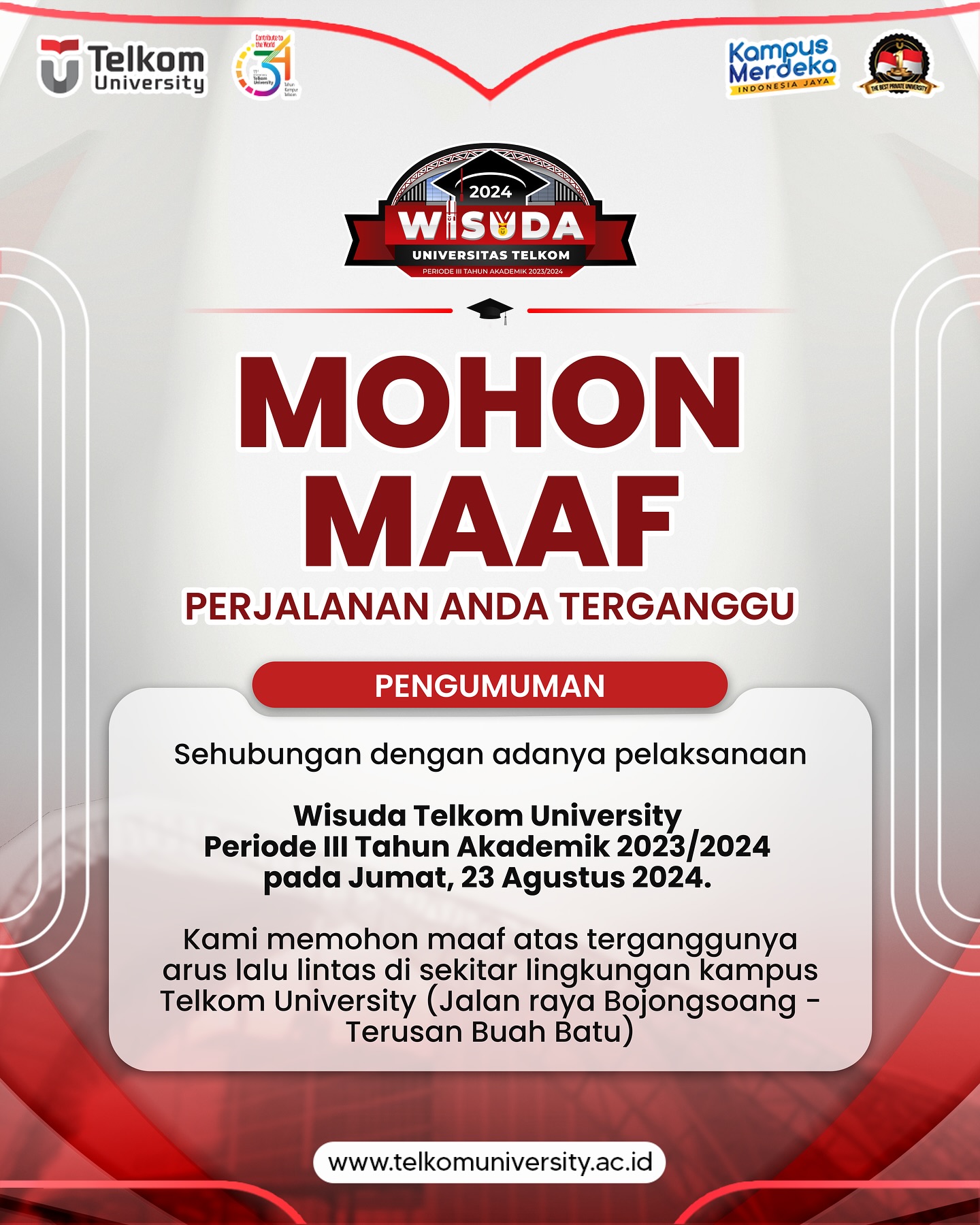 HEI TelUtizen! Sehubung akan dilaksanakannya Wisuda Telkom University Periode III Tahun Akademik 2023/2024 pada hari Jumat, 23 Agustus 2024 mohon maaf atas terganggunya perjalanan anda.