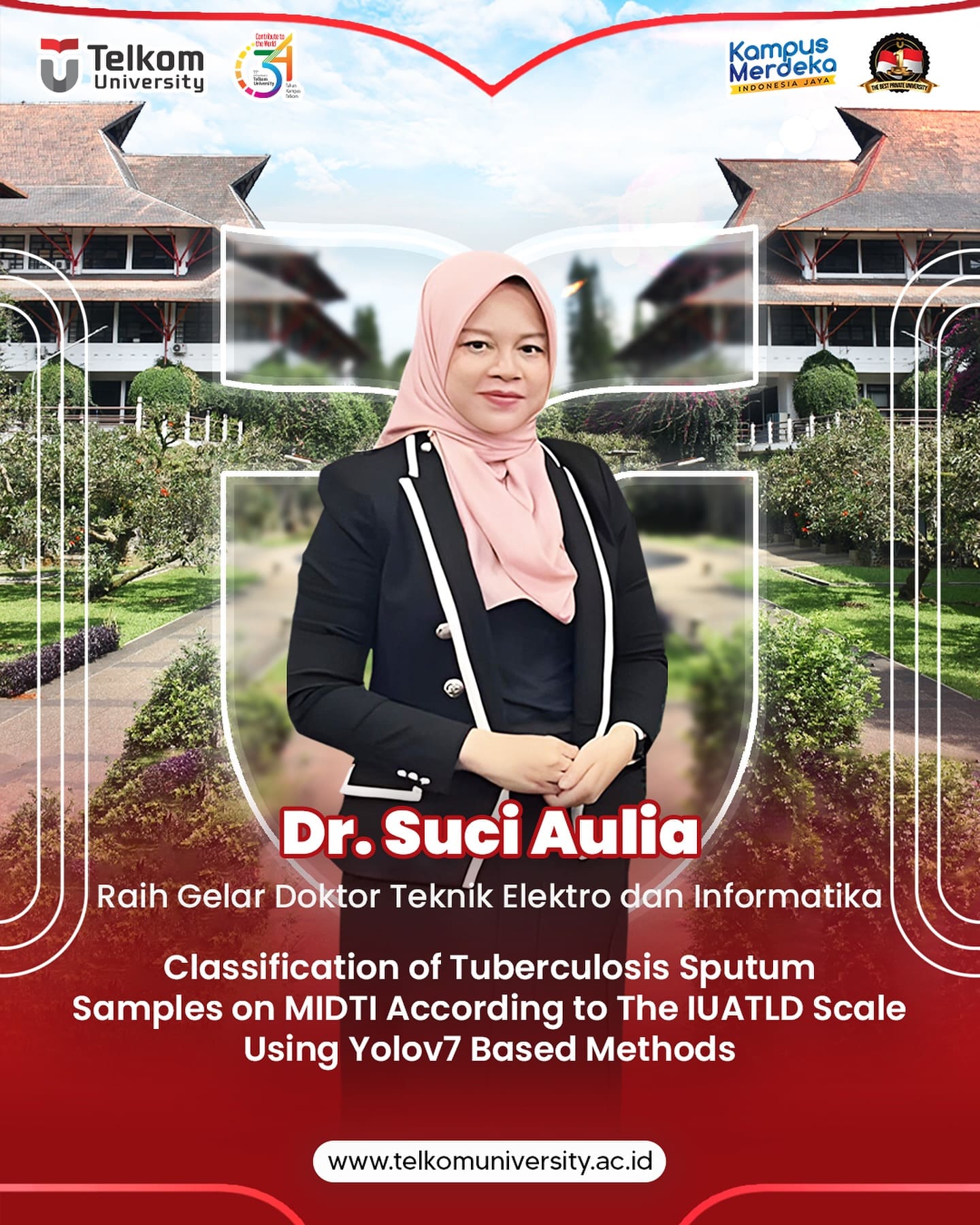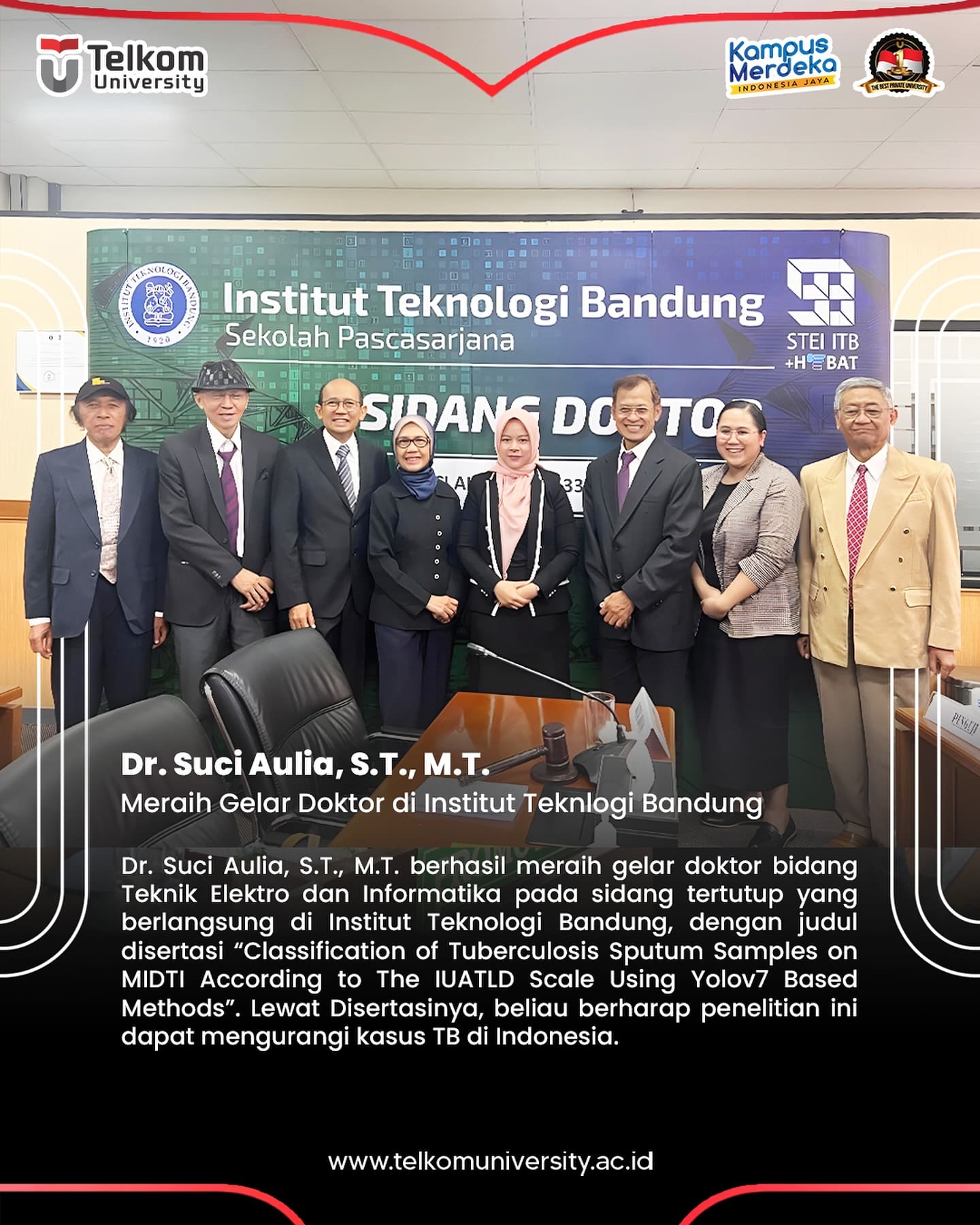 HEI TelUtizen! Dr. Suci Aulia, S.T., M.T. berhasil meraih gelar Doktornya di Institut Teknologi Bandung (ITB) dengan karya disertasinya yang berjudul βClassification of Tuberculosis Sputum Samples on MIDTI According to The IUATLD Scale Using Yolov7 Based Methods.β