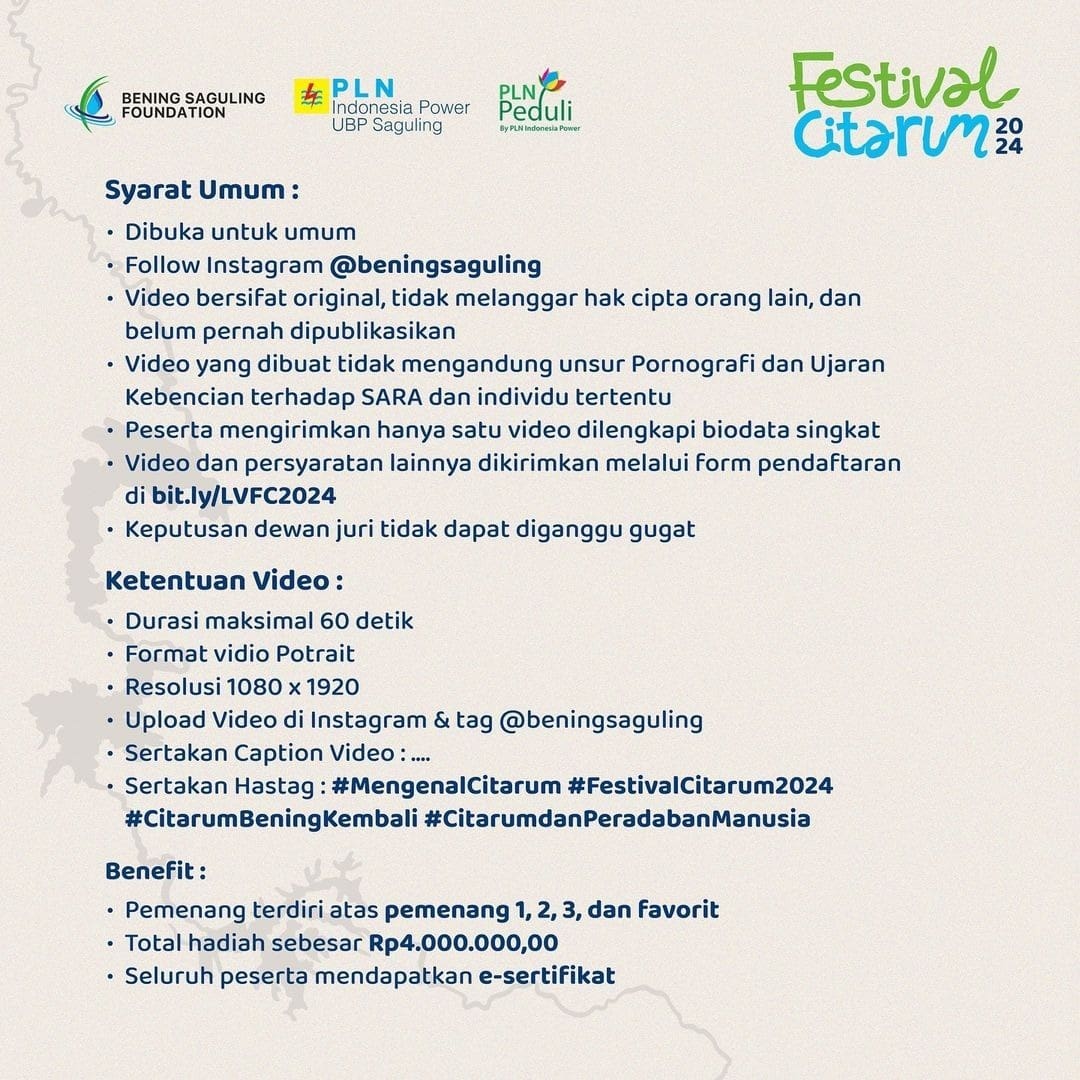 Tantangan ini bukan hanya soal menang atau kalah, tetapi tentang bagaimana kita bisa menyuarakan kepedulian terhadap lingkungan melalui karya video. Kalian bisa mengangkat cerita, pesan, atau bahkan ide-ide inovatif yang bisa menginspirasi orang lain untuk lebih peduli terhadap Sungai Citarum.