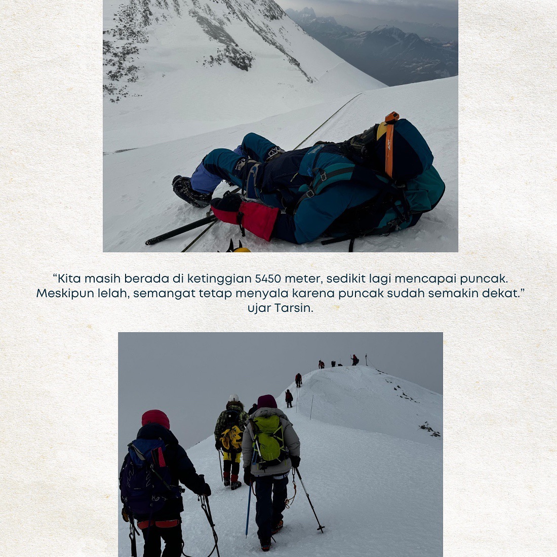 Tim mulai bergerak summit dari Stasiun Garabashi di ketinggian 3.800 MDPL pada pukul 21.00 waktu Rusia. Kondisi angin salju saat mendekati puncak sangat kencang mencapai 40 km/jam sehingga tim harus bertahan dari ganasnya terpaan angin salju. Namun, pada ketinggian 5.450 MDPL, salah satu anggota tim yaitu Tarsin @tarsin.tarigann mengalami cedera pada kaki yang mengharuskannya untuk kembali turun ke bawah karena faktor keamanan. Pendakian tetap dilanjutkan oleh anggota tim lainnya, Abdul, yang terus bergerak ke arah puncak. Diiringi tekad yang kuat, Abdul @abdh_47 akhirnya berhasil mewakili kita semua untuk mencapai Puncak Gunung Elbrus!