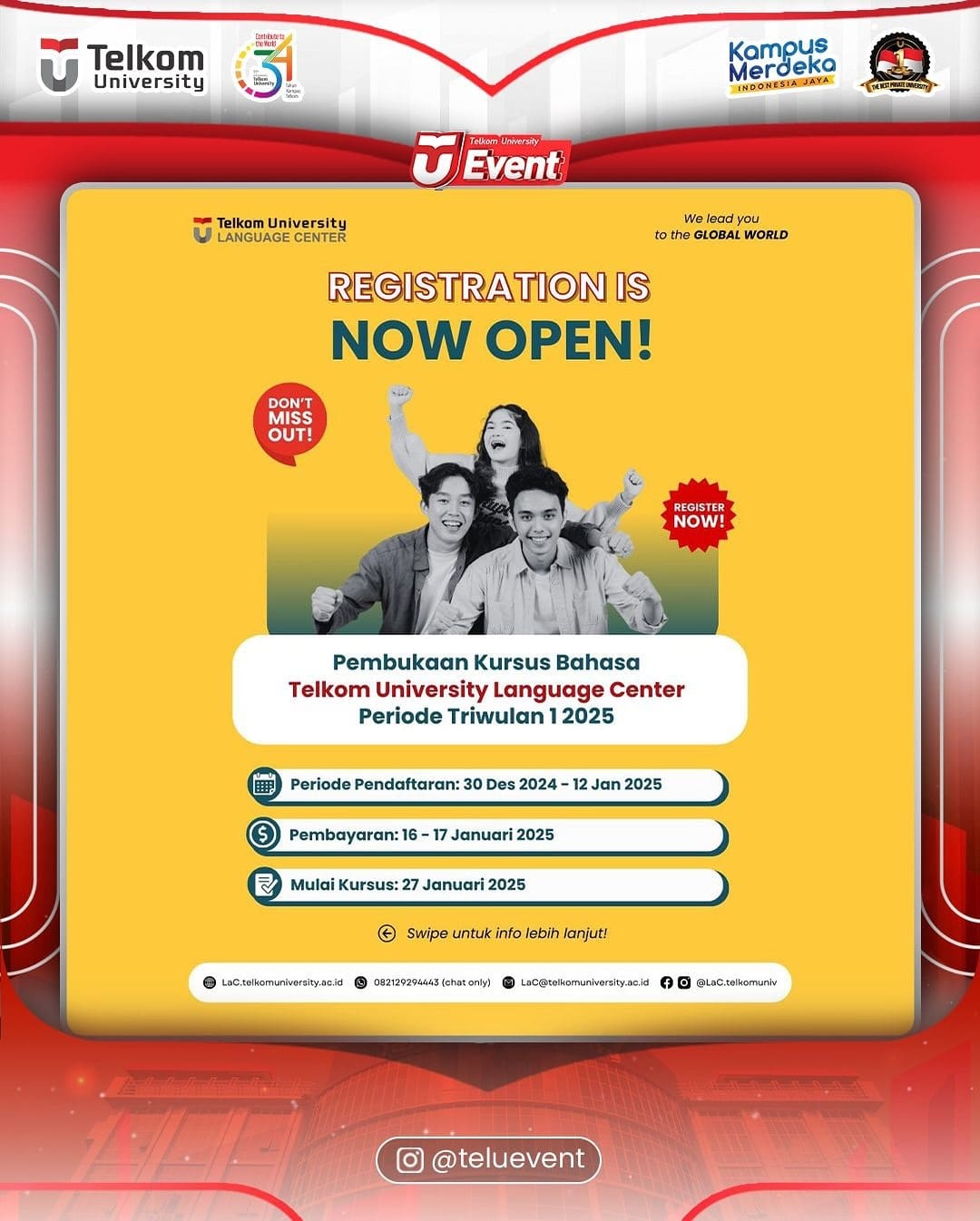 Siapa nih teman-teman yang udah enggak sabar nungguin?! Pendaftaran kursus bahasa di Telkom University Language Center untuk periode Triwulan 1 2025 akhirnya telah dibuka!π₯³