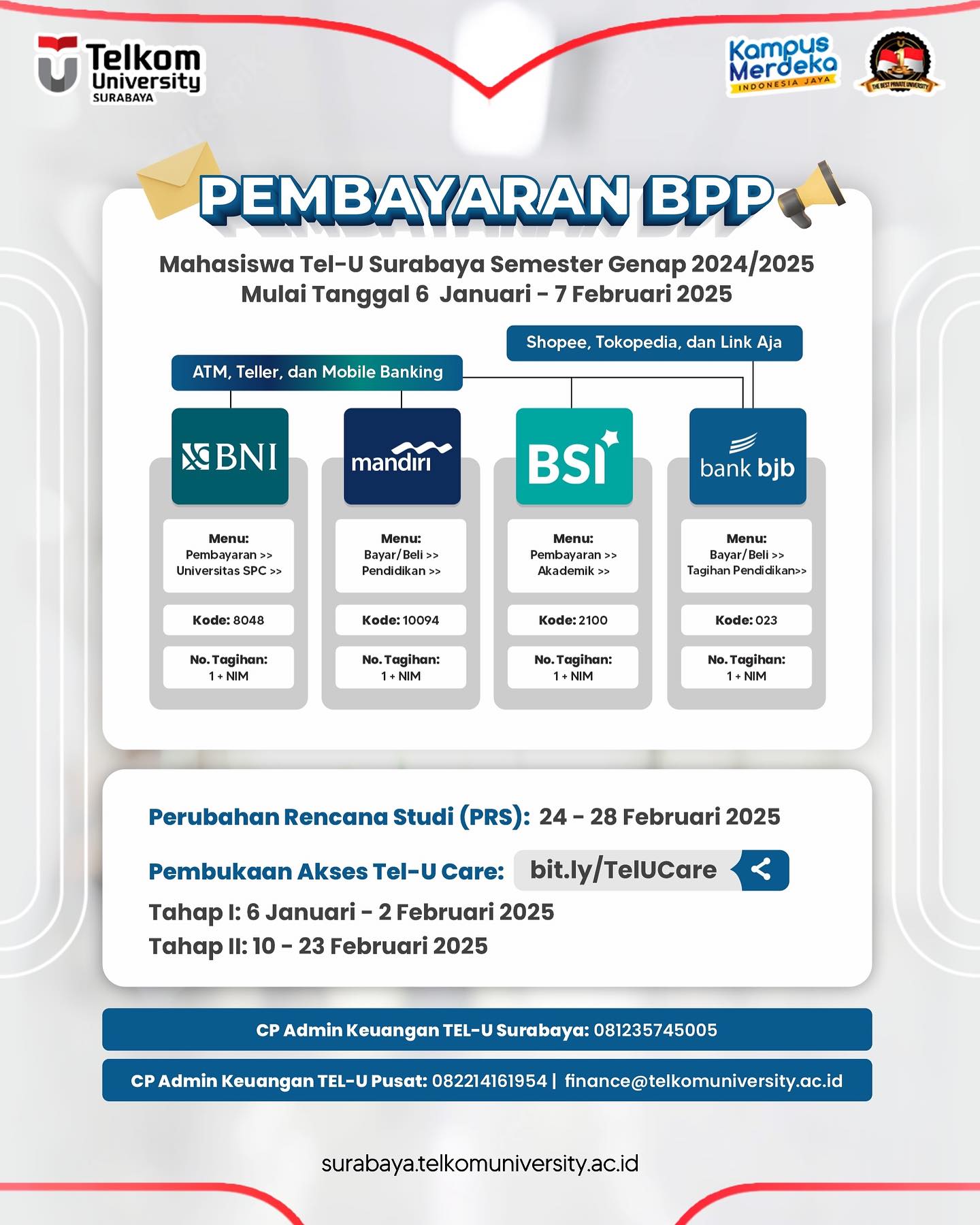 Untuk pertanyaan seputar pembayaran BPP, bisa langsung ke Student Service Center @ssc.telkomsby di lantai 2 gedung kampus atau kontak Admin Keuangan ya 0812-3574-5005