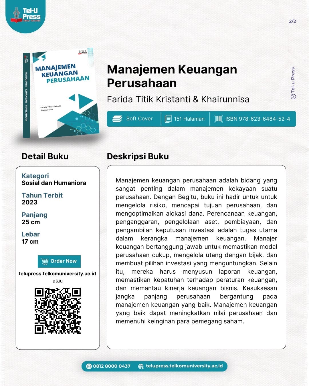 Buku Manajemen Keuangan Perusahaan adalah panduan komprehensif untuk mengelola kekayaan dan risiko perusahaan, mencapai tujuan finansial, dan mengoptimalkan alokasi dana. Buku ini membahas perencanaan keuangan, penganggaran, pengelolaan aset, pembiayaan, dan investasi. Buku ini juga dapat membantu manajer keuangan dalam mengambil keputusan yang menguntungkan dan memenuhi keinginan para pemegang saham. Tingkatkan nilai perusahaan dan penuhi harapan pemegang saham dengan strategi keuangan yang tepat. Mari realisasikan perusahaan impian Telutizen melalui buku ini !! 📊✨
