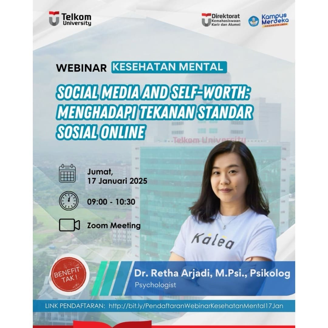 Direktorat Kemahasiswaan, Pengembangan Karier, dan Alumni melalui Bagian Pengembangan Karakter dan Kesejahteraan Mahasiswa mengundang kalian untuk mengikuti Webinar Kesehatan Mental. Yuk, jaga kesehatan mental kalian dengan mendapatkan wawasan dan tips dari para ahli!