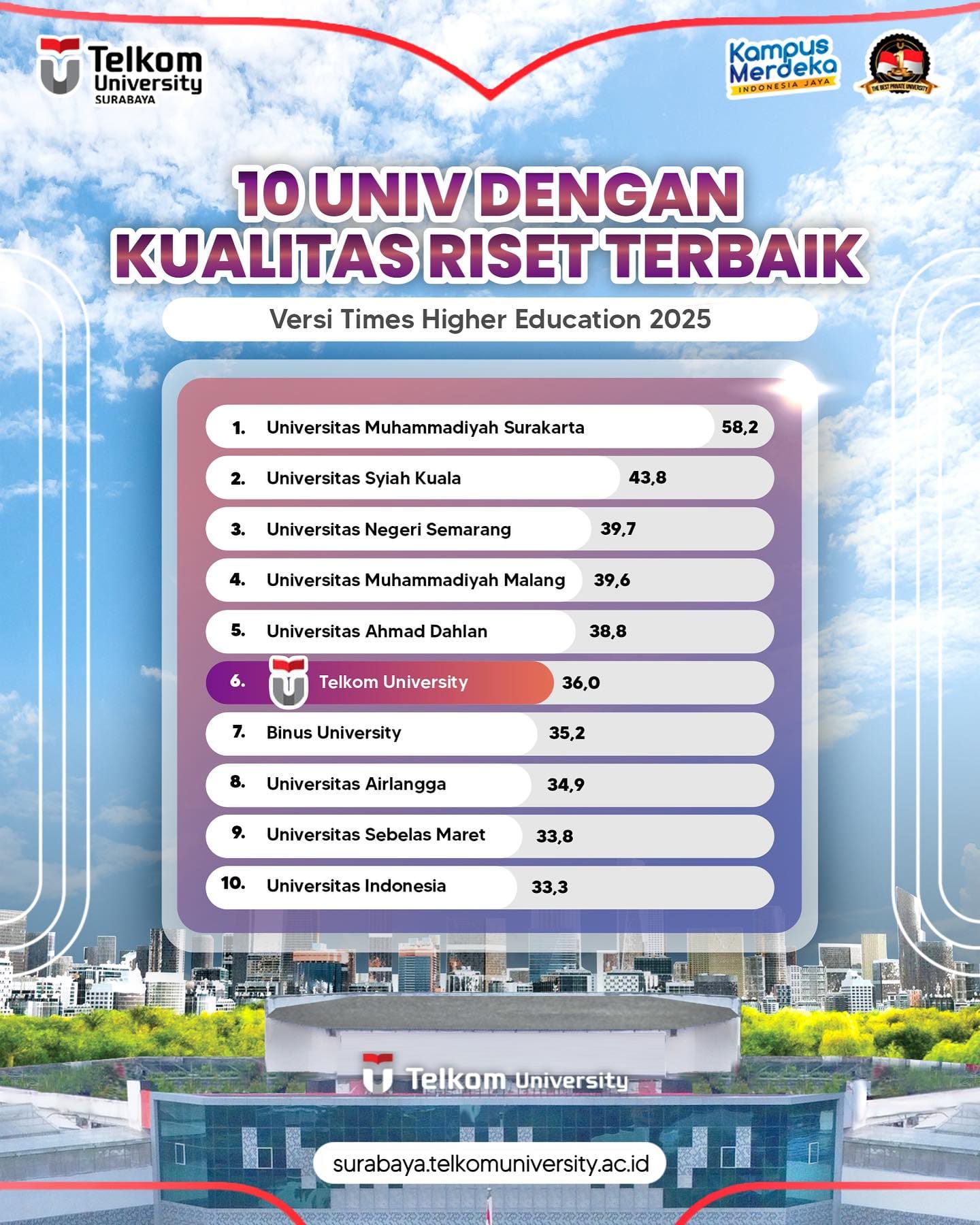 Bangga! Telkom University berhasil menempati peringkat ke-6 dengan skor 36,0 dalam kategori Kualitas Riset versi Times Higher Education (THE) 2025 di Indonesiaπβ¨