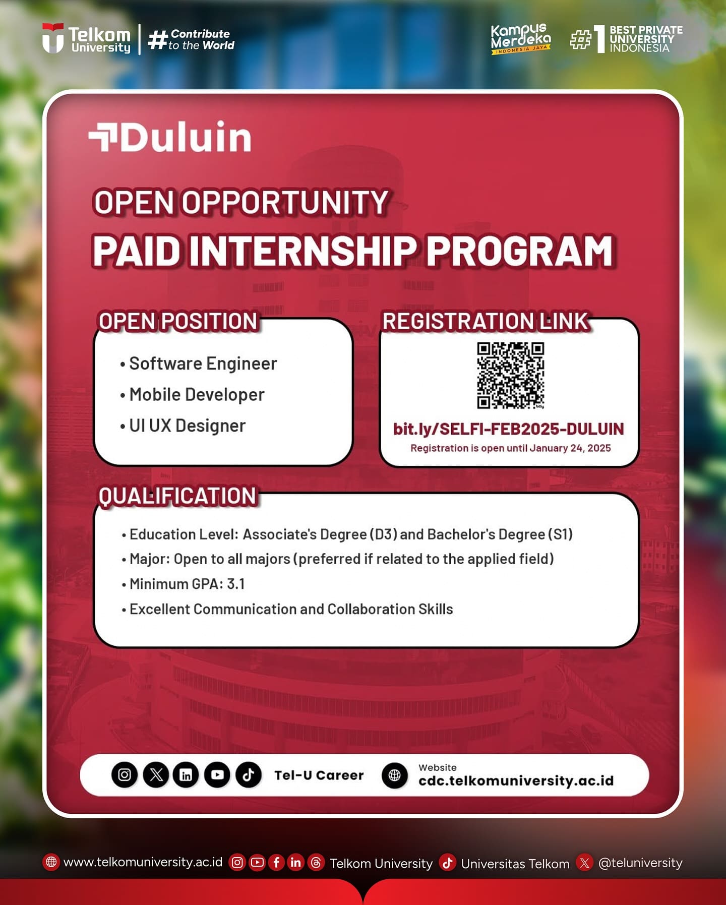 #TelkomUniversity #KampusSwastaTerbaik #CreatingTheFuture #ContributeToTheWorld #EntrepreneurialUniversity #SustainabilityUniversity