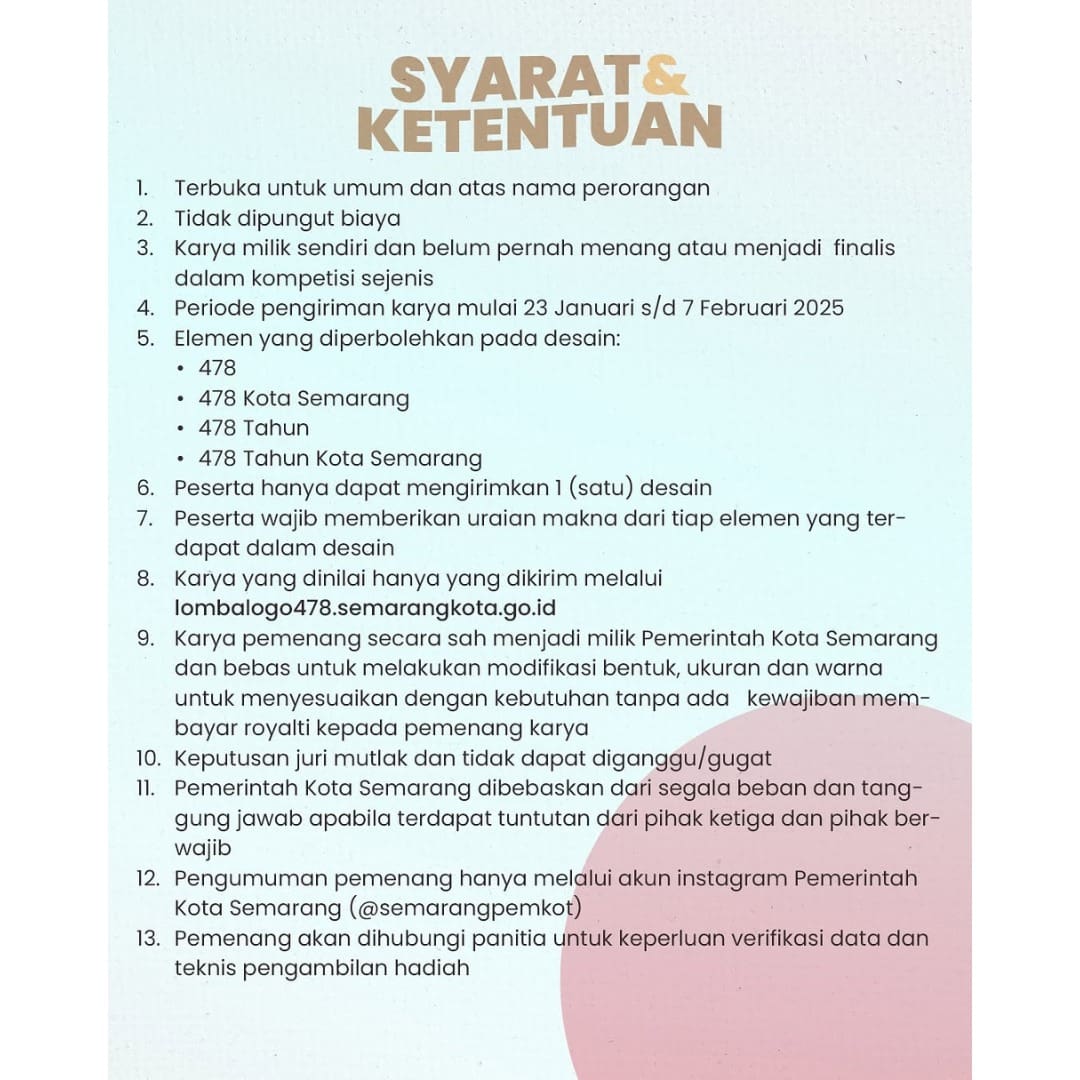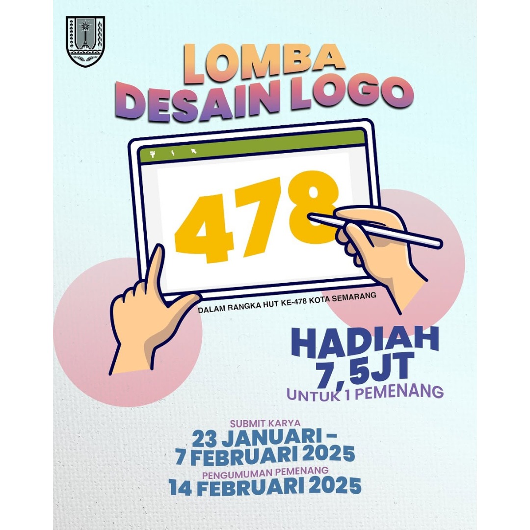 Luuurr, dalam rangka menyambut hari jadi Kota Semarang yang ke-478, Pemkot Semarang kembali menyelenggarakan lomba desain logo. Lomba ini terbuka untuk umum, jadi siapapun bisa ikut. Akan ada hadiah sebesar Rp.7.500.000 untuk 1 orang pemenang