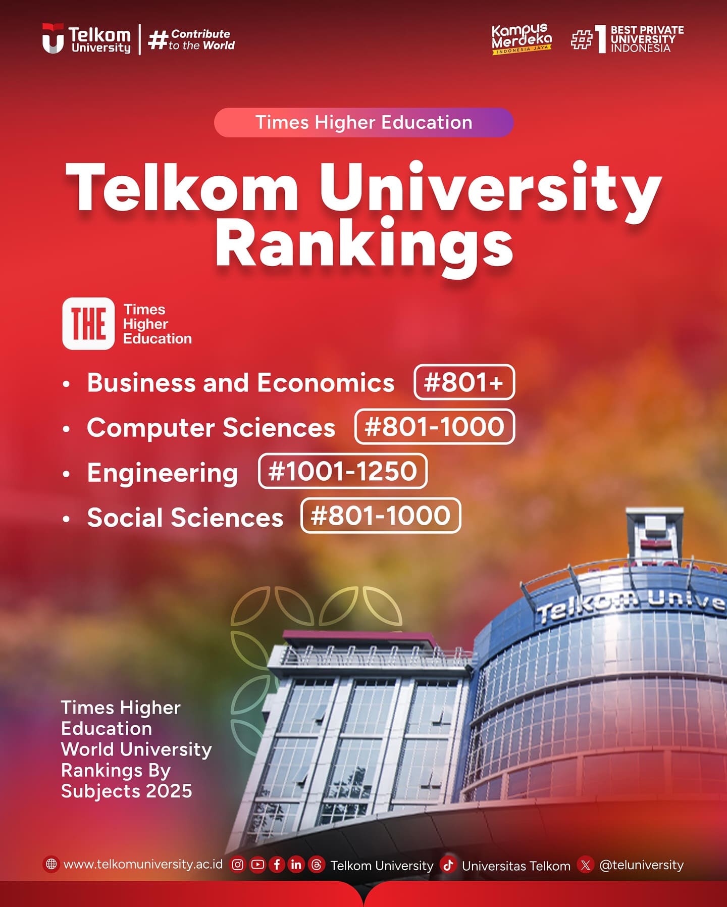Telkom University berhasil meraih peringkat pada Times Higher Education World University Rankings by Subjects 2025!