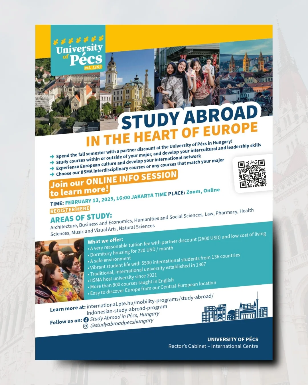 Join our Info Session on February 13, 2025, and discover how you can study abroad at the University of Pécs, Hungary this fall!