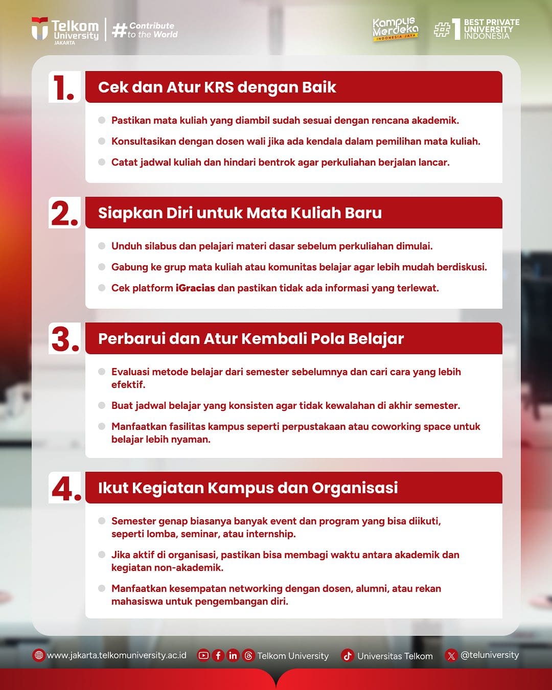 Liburan sudah usai, sekarang waktunya kembali ke rutinitas kampus! Awal semester genap jadi momen yang tepat buat atur strategi, susun jadwal, dan mulai kebiasaan baru yang lebih produktif. Jangan lupa persiapkan diri dengan baik, dan tetap semangat ya!