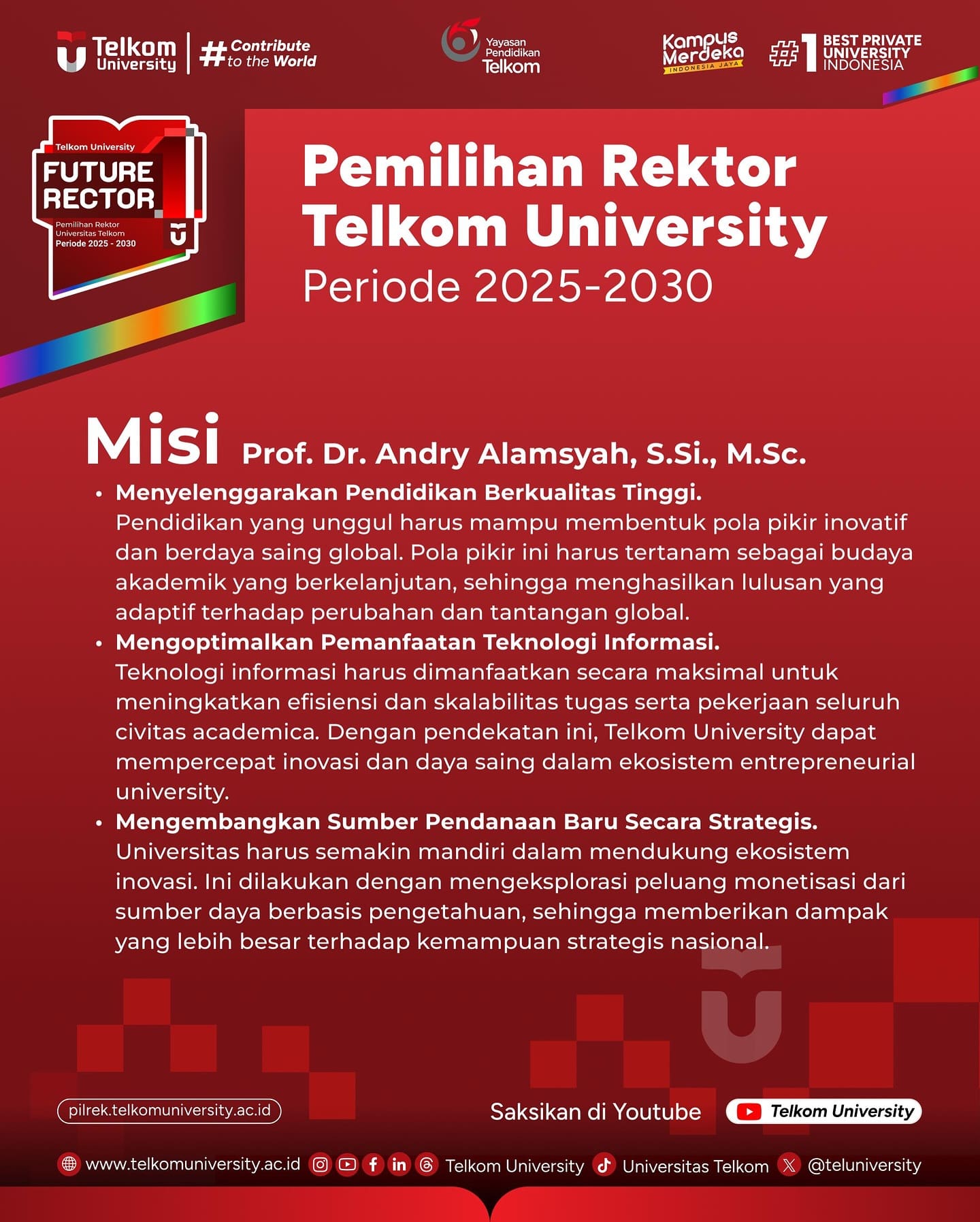 Berikut merupakan Visi dan Misi dari masing-masing Bakal Calon Rektor Telkom University periode 2025 – 2030