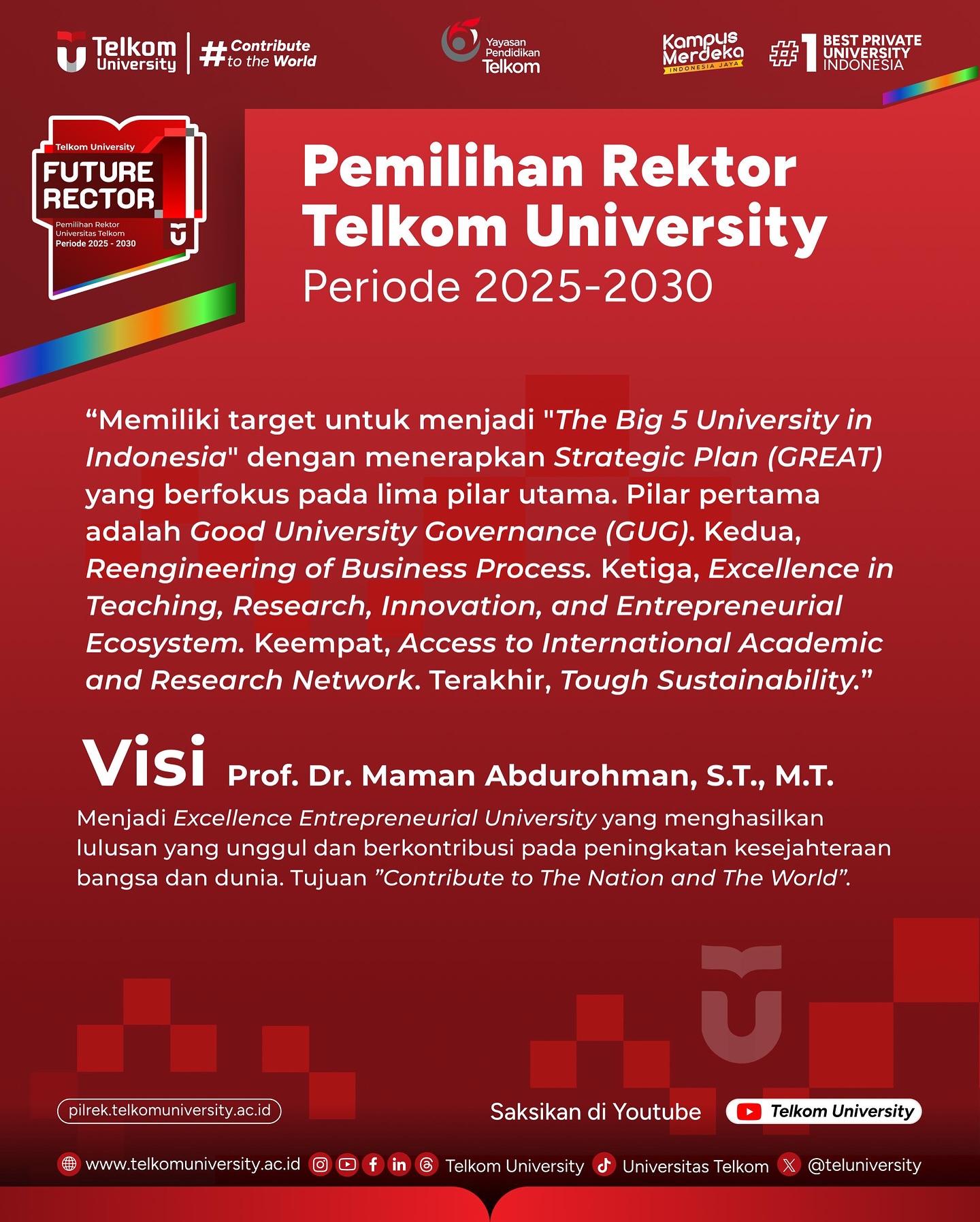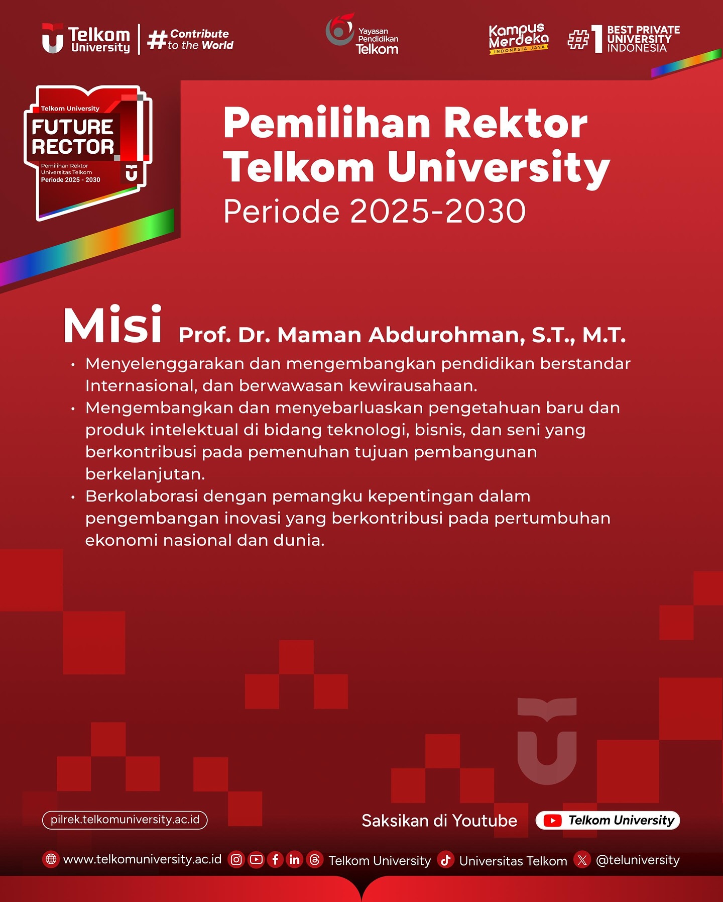 Berikut merupakan Visi dan Misi dari masing-masing Bakal Calon Rektor Telkom University periode 2025 – 2030
