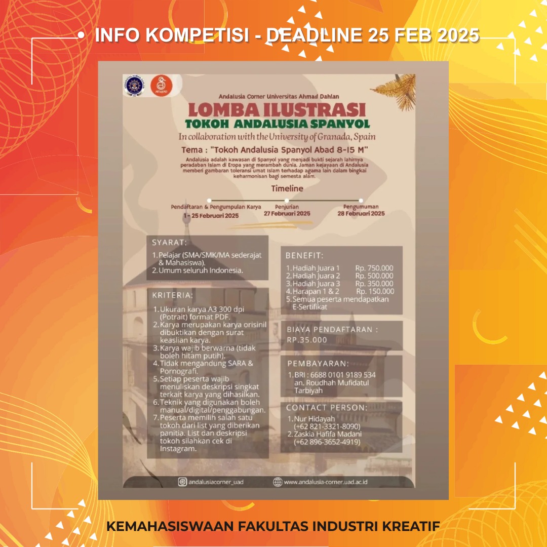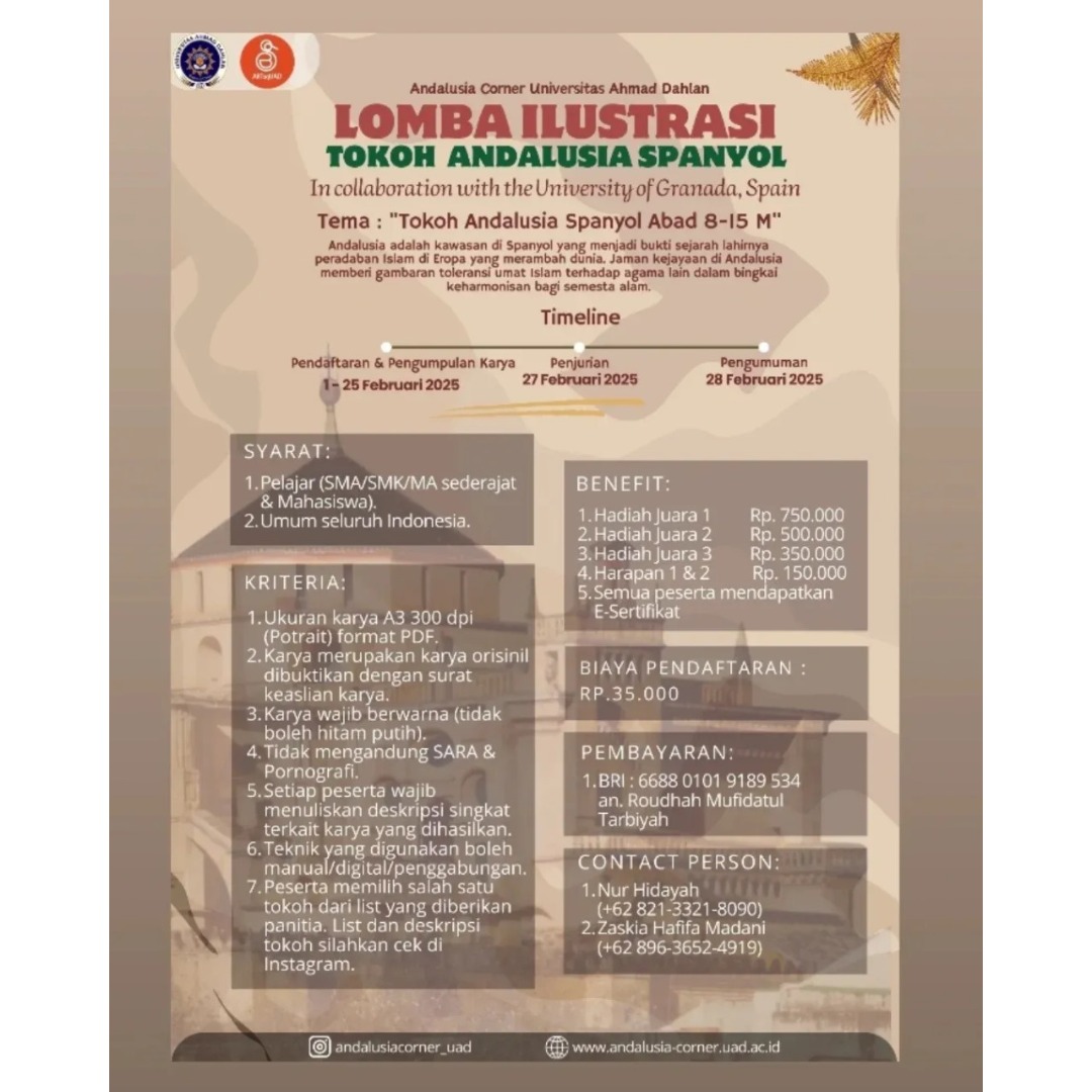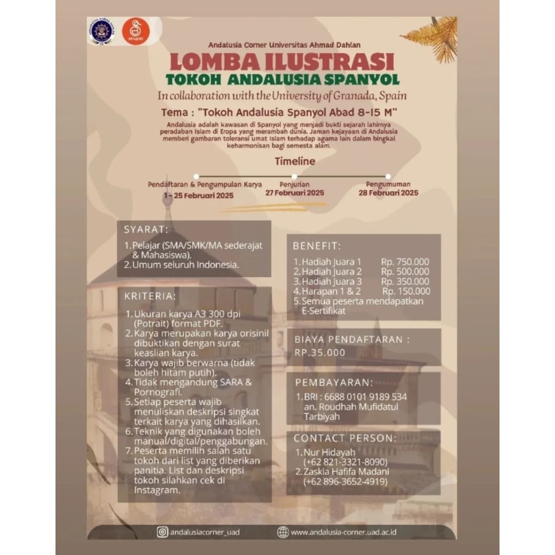 Halo para seniman, kali ini Andalusia Corner Universitas Ahmad Dahlan Yogyakarta sedang mengadakan Lomba Ilustrasi yang bertema “Tokoh Andalusia Spanyol Abad 8-15 Masehi”. Perlombaan ini dilaksanakan secara daring (online). Kamu memiliki kesempatan untuk memamerkan hasil karyamu dan tentunya berkesempatan memenangkan hadiahnya juga lho 🤩