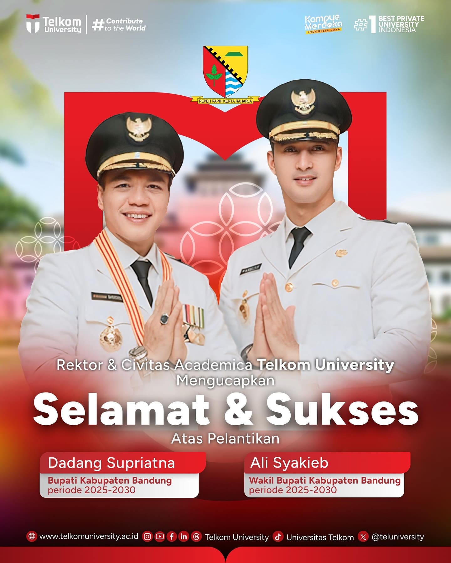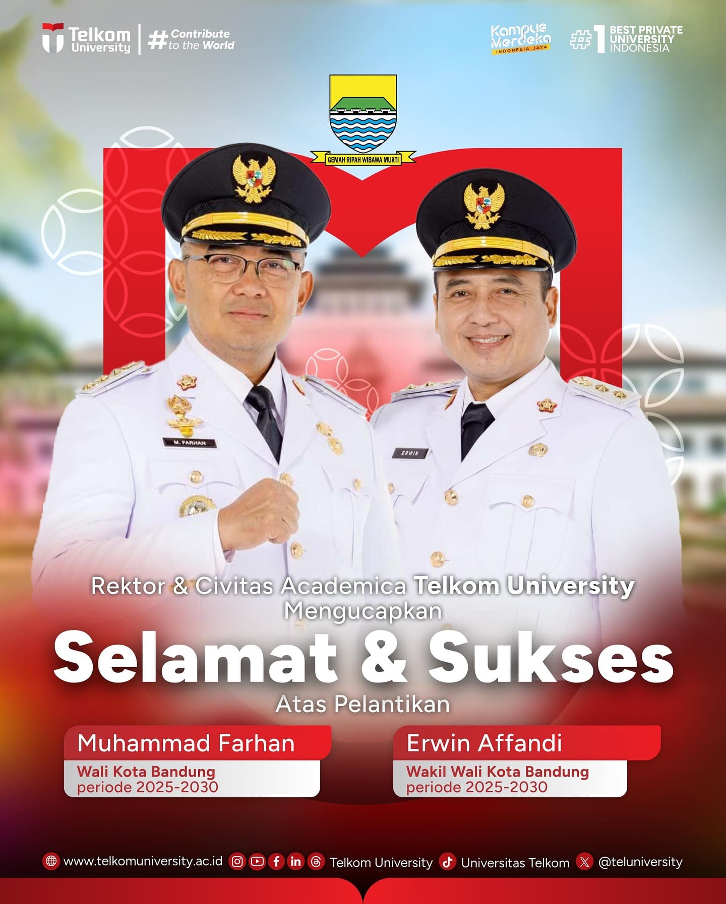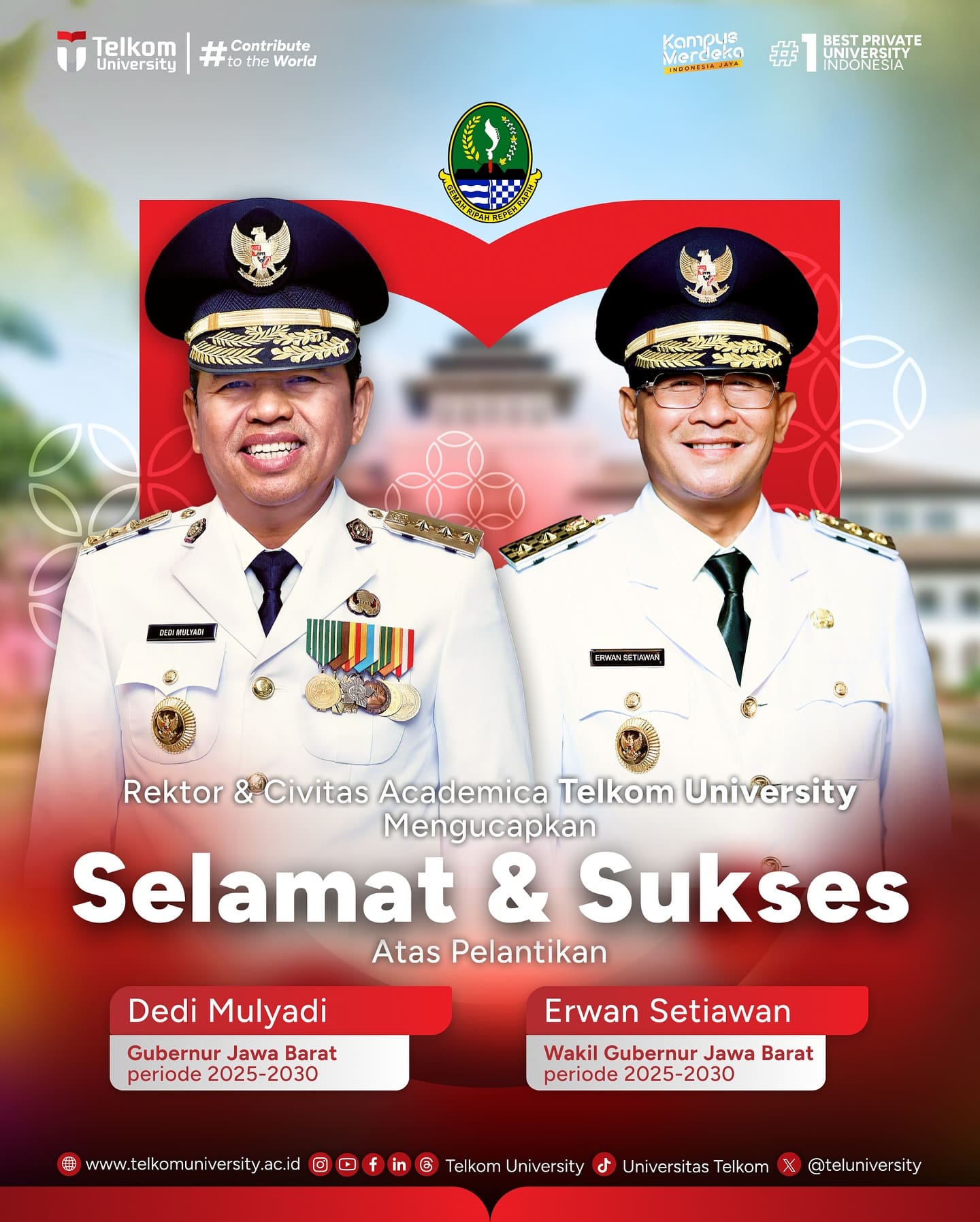 Rektor beserta Civitas Academica Telkom University mengucapkan selamat dan sukses atas pelantikan: